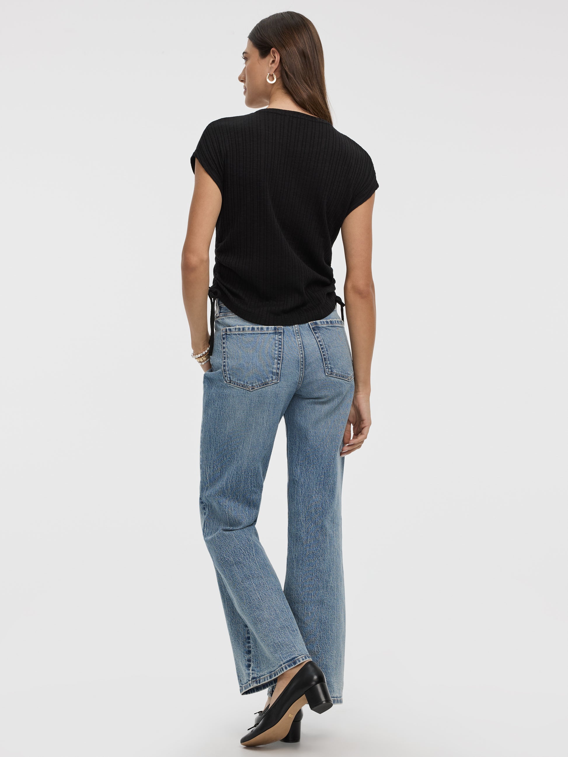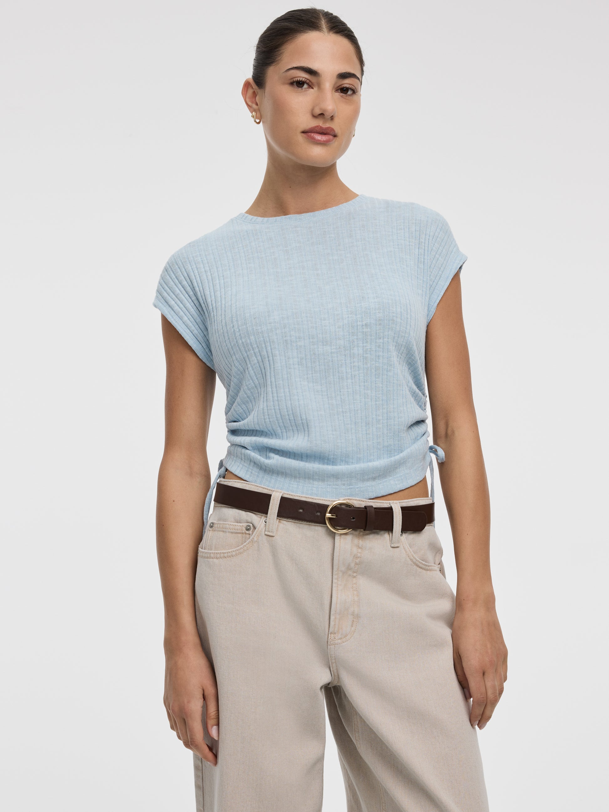 This adorable ribbed top designed with extended sleeves features drawstrings at the hem that create feminine side shirrings. A great piece that is sure to elevate your style on any occasion.