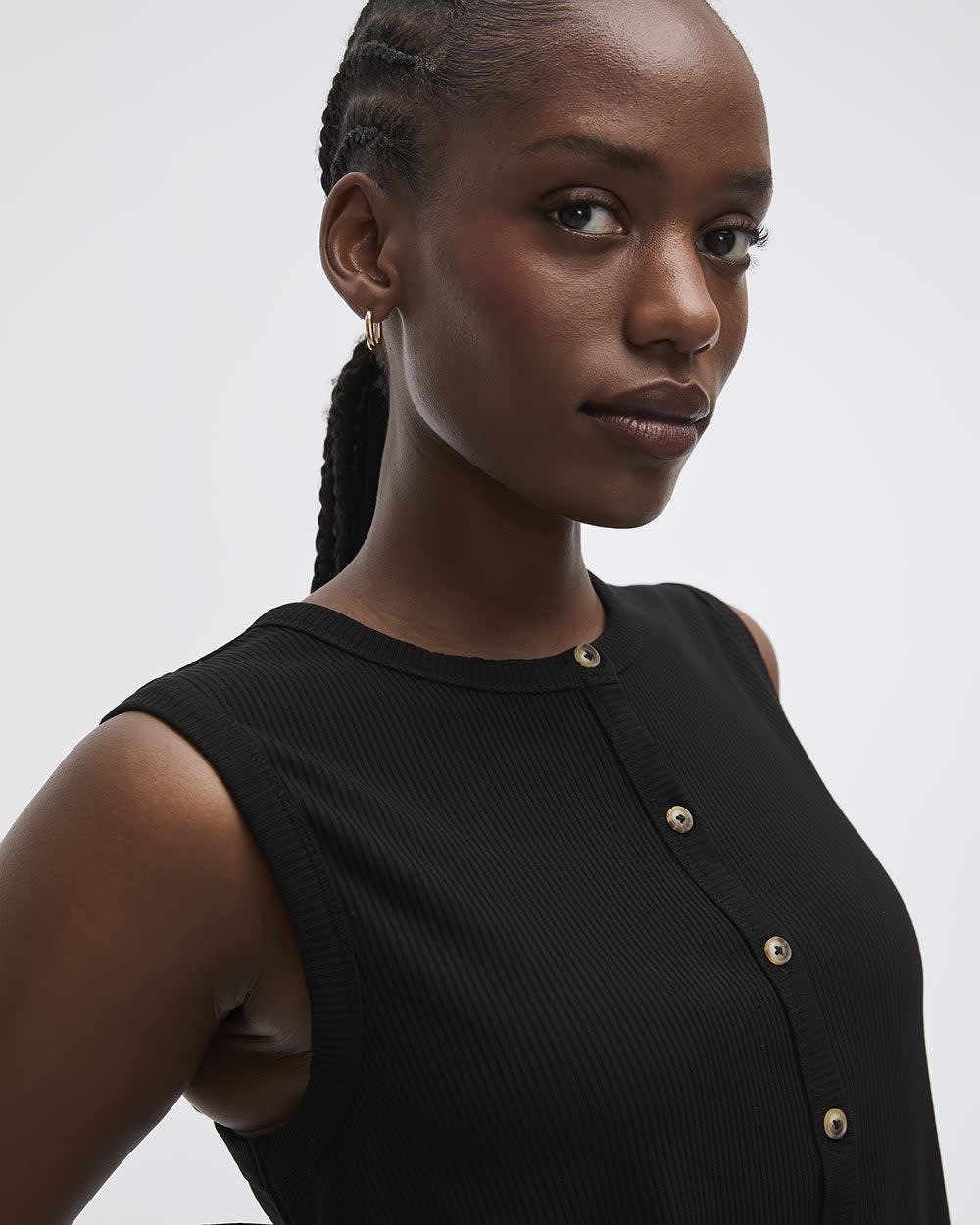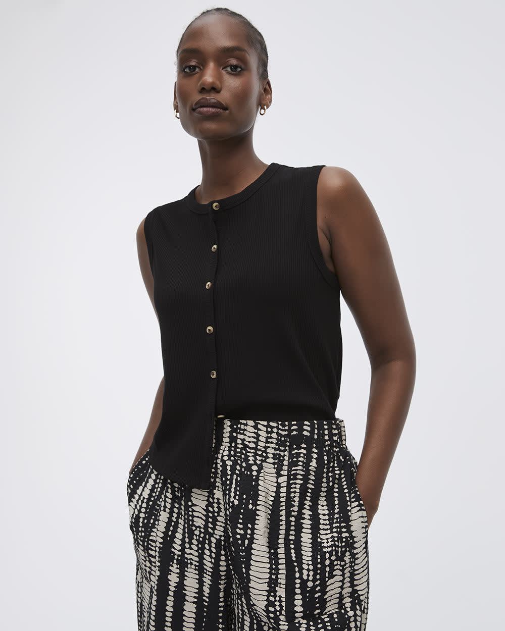 This adorable ribbed crew-neck tank featuring a buttoned-down front is perfect for summer.