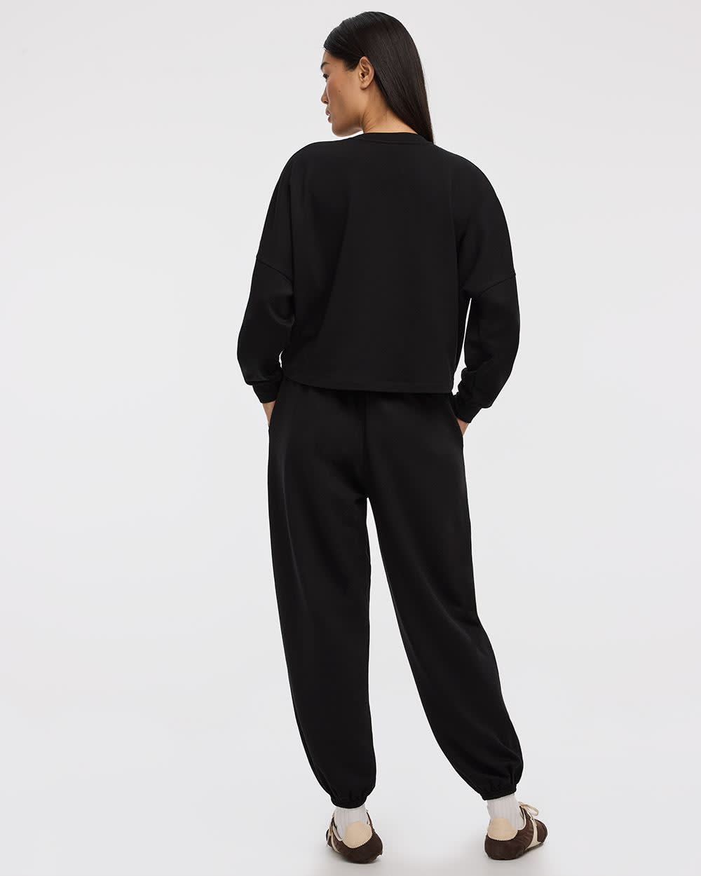 We love this cropped Frech Terry sweatshirt. A unique piece to wear over a sports bra and legging, perfect to get to and from your hot yoga class.