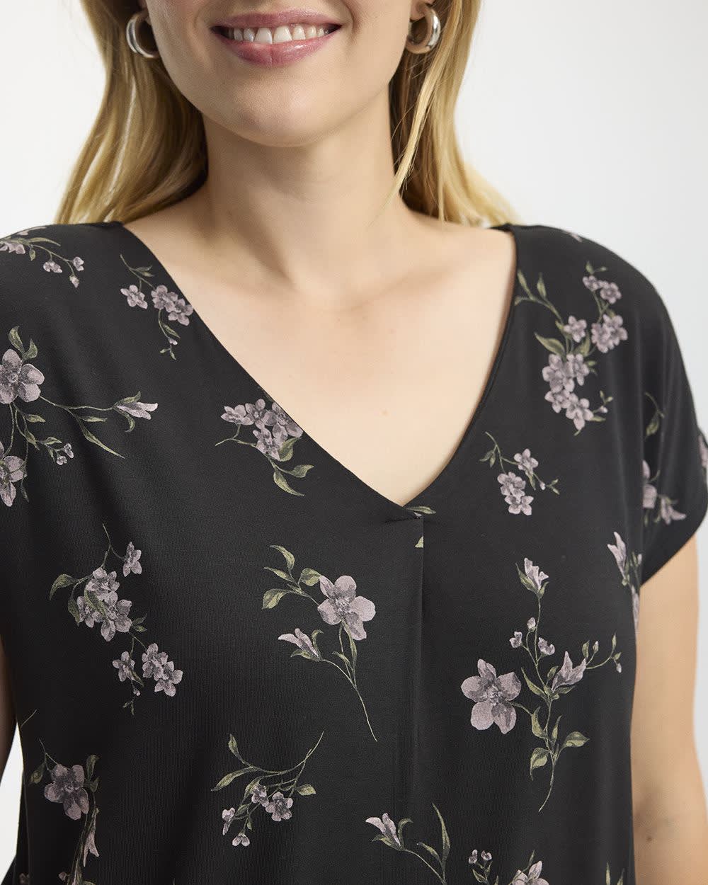 "This super comfortable semi-fitted tunic features a V neckline and extended sleeves. Pairs perfectly with your favourite pair of leggings.