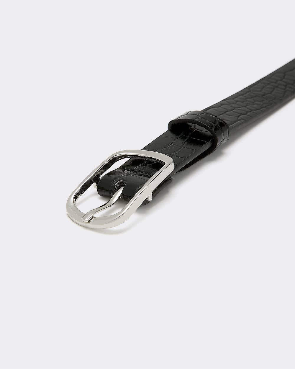 This sleek faux crocodile leather belt, featuring a trendy metal buckle, is sure to add some personality to your outfit.