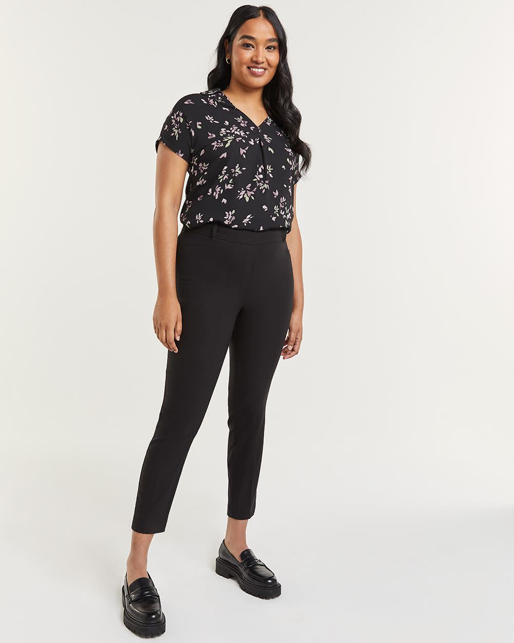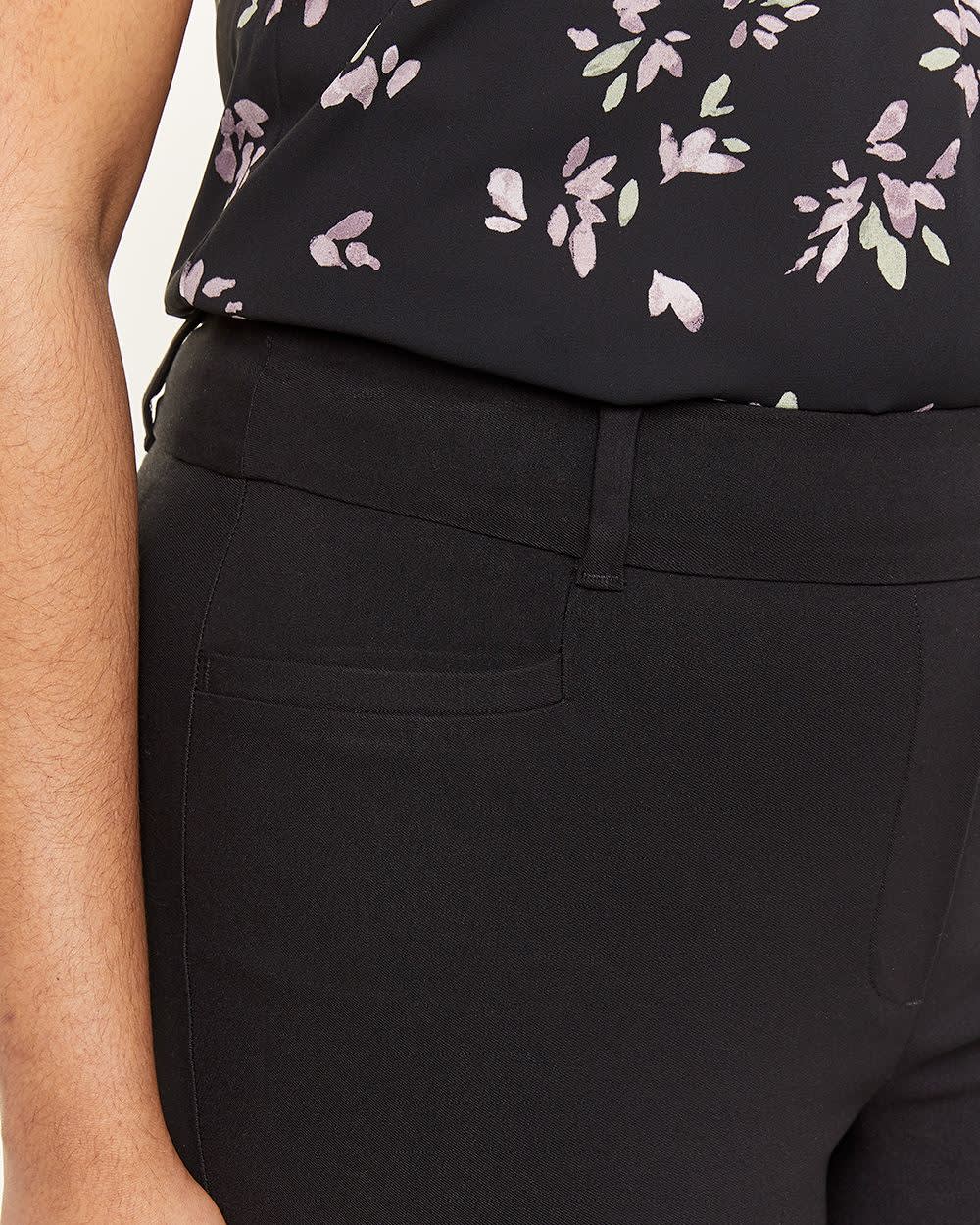 Ankle-grazing retro-inspired pants that are fit for the office and comfortable enough for everyday wear. This slim leg pant is fashioned from stretch woven fabric with a high-rise comfort waistband. Styled with slanted front pockets accented with piping and back welt pockets.