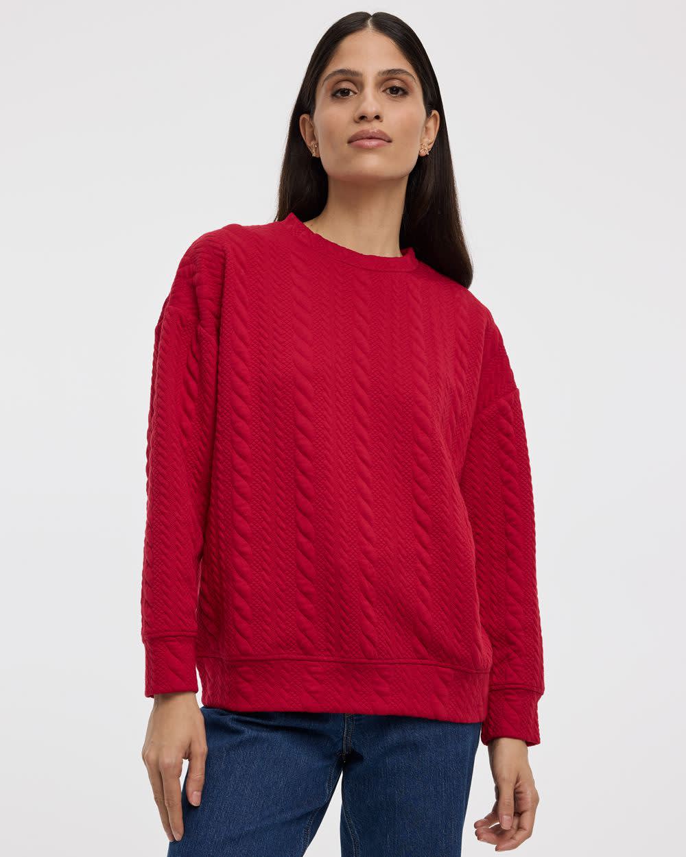 You'll love the cozy comfort of this crew-neck sweatshirt, made with long sleeves and featuring lovely cable stitches that make it unique.