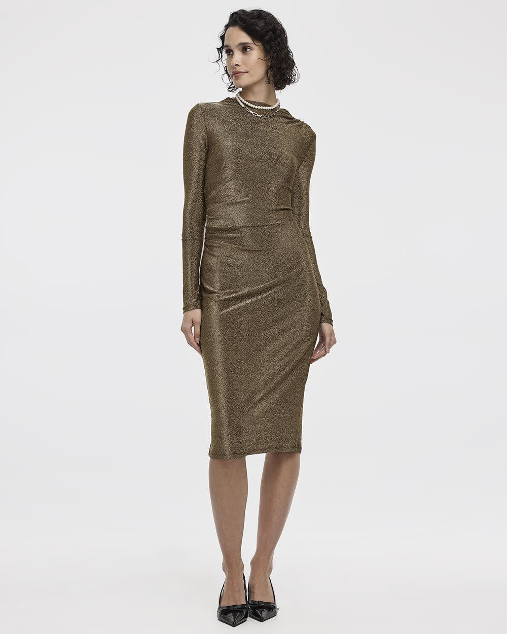This elegant bodycon dress made in a beautiful knit featuring shimmery metallic fibres is sure to make you stand out. A perfect dress for any festivities.