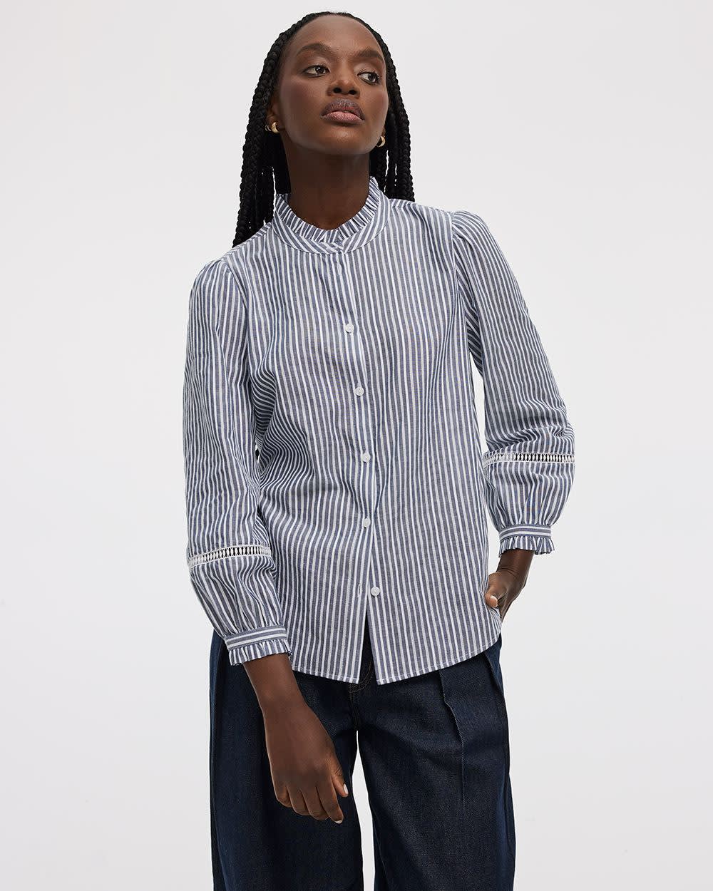 "This adorable blouse, decorated with embroidered details, features a romantic mock neckline adorned with ruffles and 3/4 puffy sleeves that will add a feminine touch to your outfit.