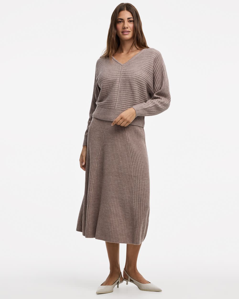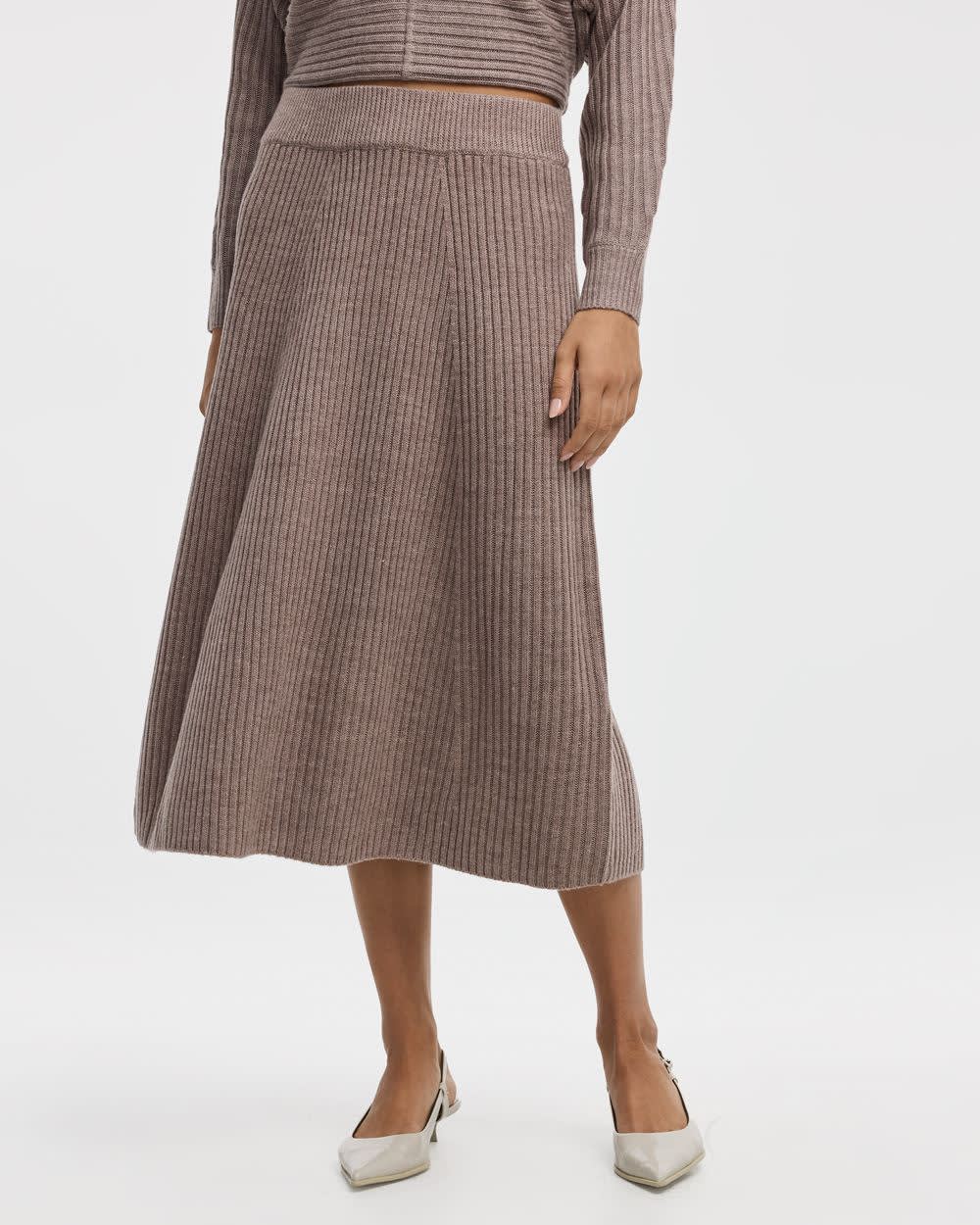 This ribbed knit midi skirt is designed in a flattering A-line silhouette, combining cozy texture with effortless elegance for a versatile everyday style.