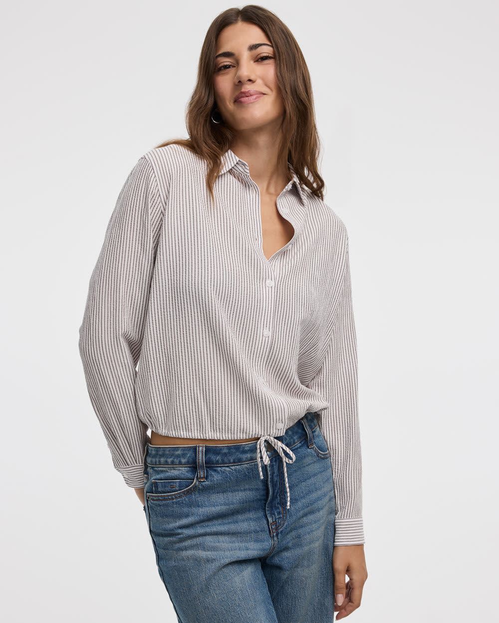 Seersucker Long-Sleeve Buttoned-Down Blouse