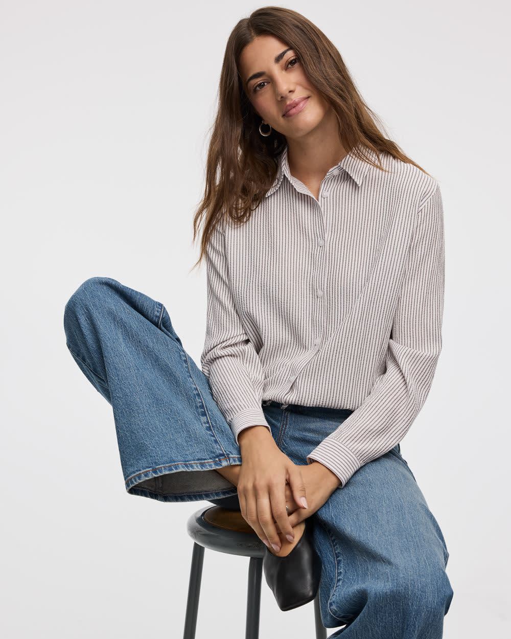 Simple, yet elegant, this lovely buttoned-down blouse made in a cozy seersucker fabric pairs perfectly with any bottom.
