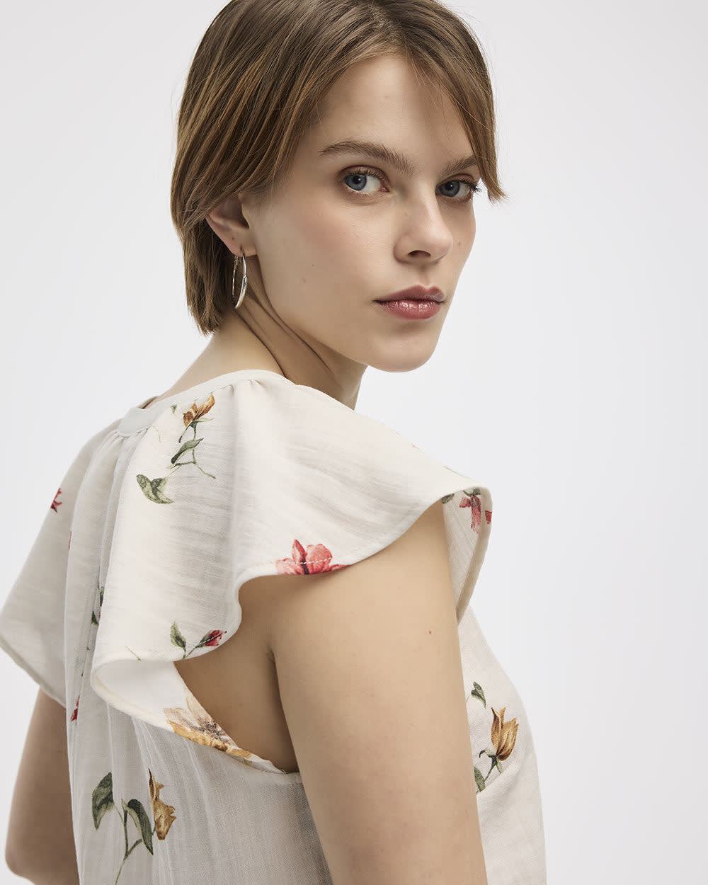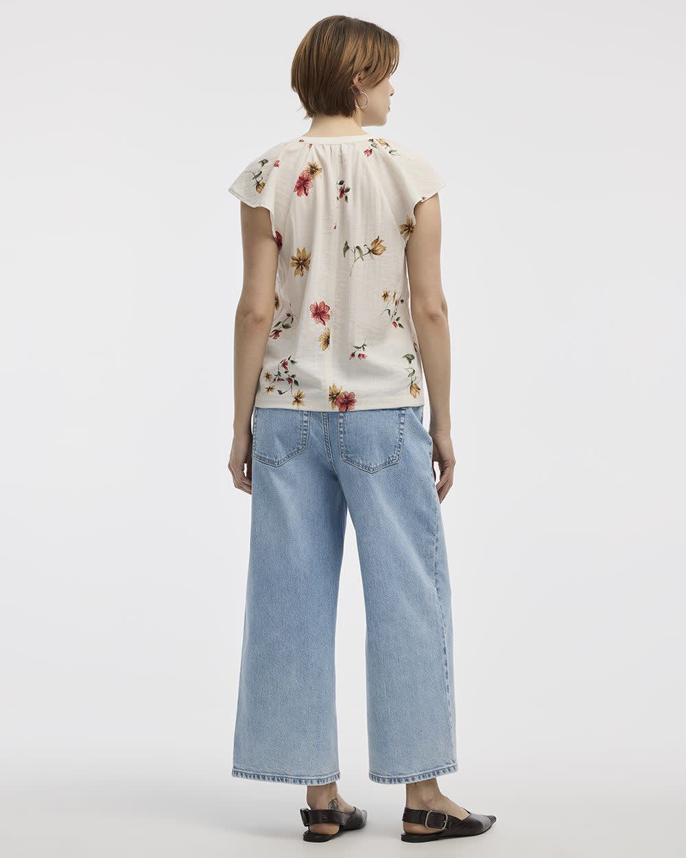 "This adorable semi-fitted split-neck blouse featuring feminine flutter sleeves is an ideal piece for your everyday life. Pairs perfectly with your favourite jeans.