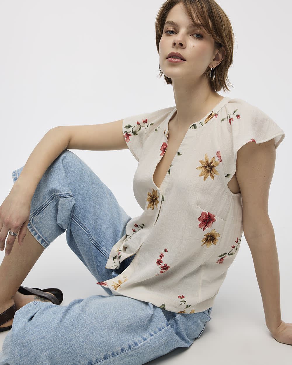 Short-Flutter-Sleeve Split-Neck Buttoned-Down Blouse