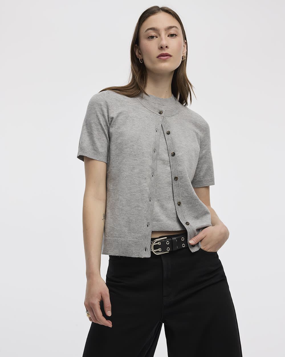 Made in a soft knit, this crew-neck cardigan designed with short sleeves pairs perfectly with any bottom. Wear it by itself or as a layer to add some dimension to your style.