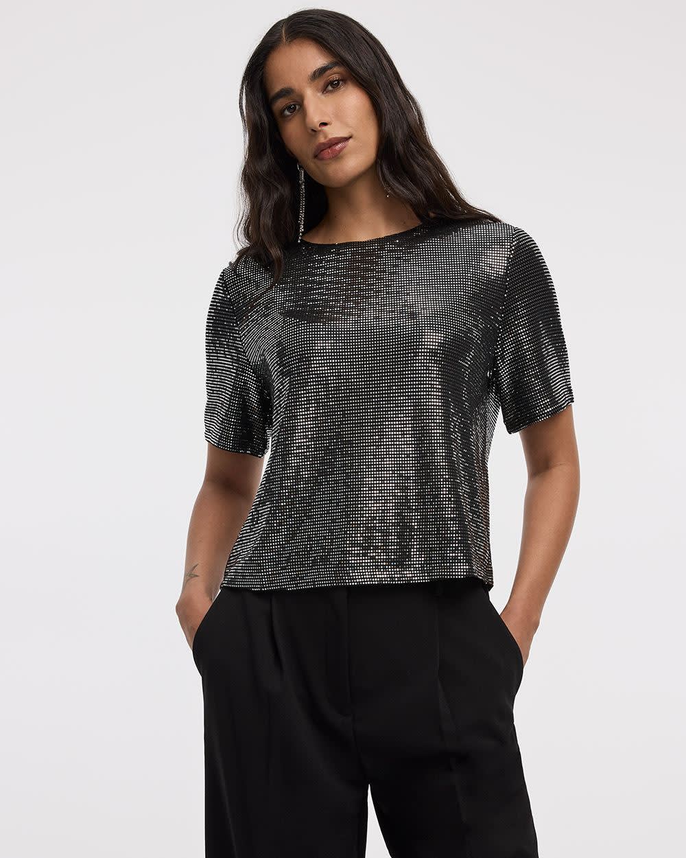 This adorable semi-fitted short-sleeve top featuring shiny sequins is ideal for a night out. Pairs perfectly with your favourite jeans.