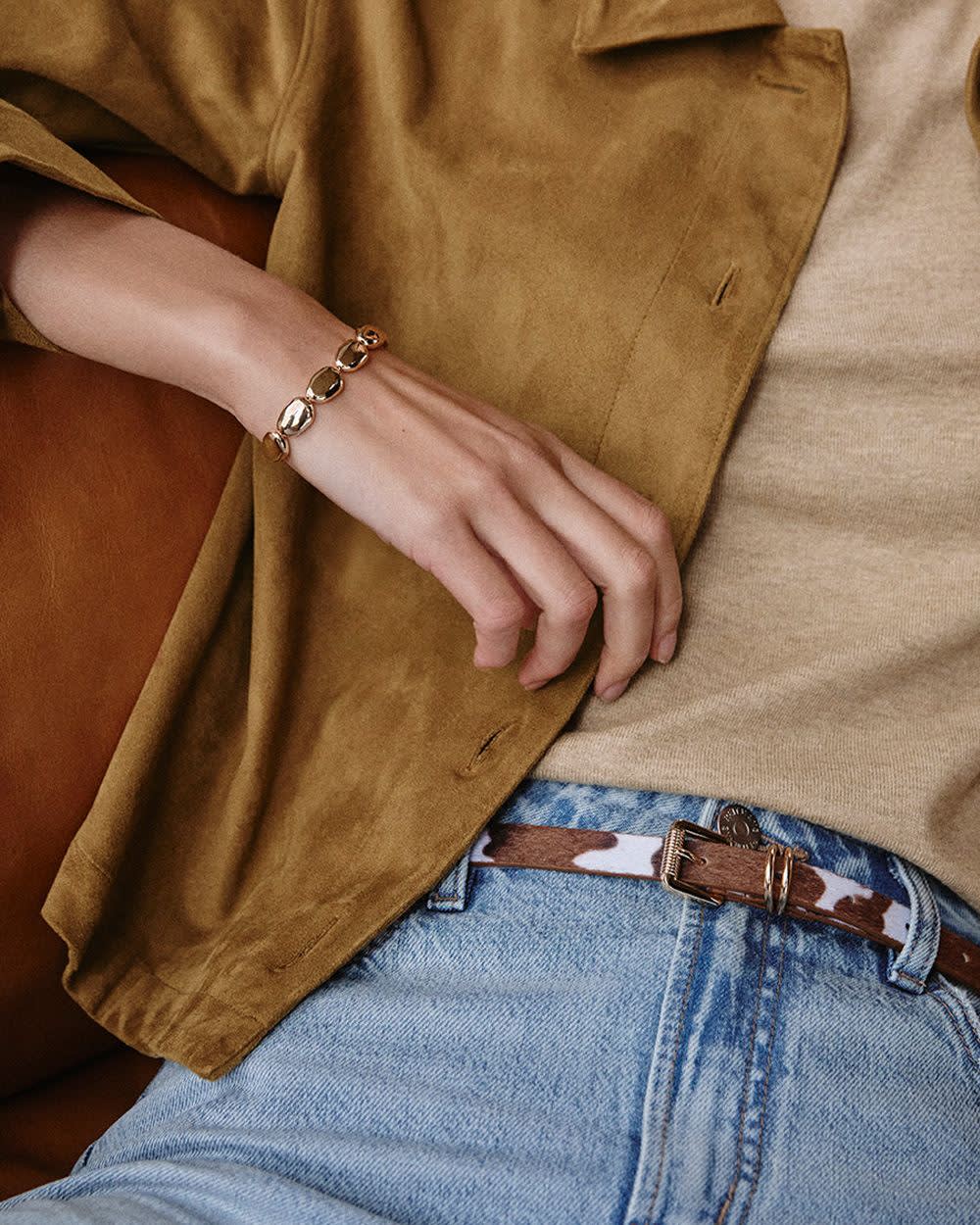 "This sleek skinny belt featuring a clean buckle and a trendy cow print is a definite essential to add to your wardrobe.