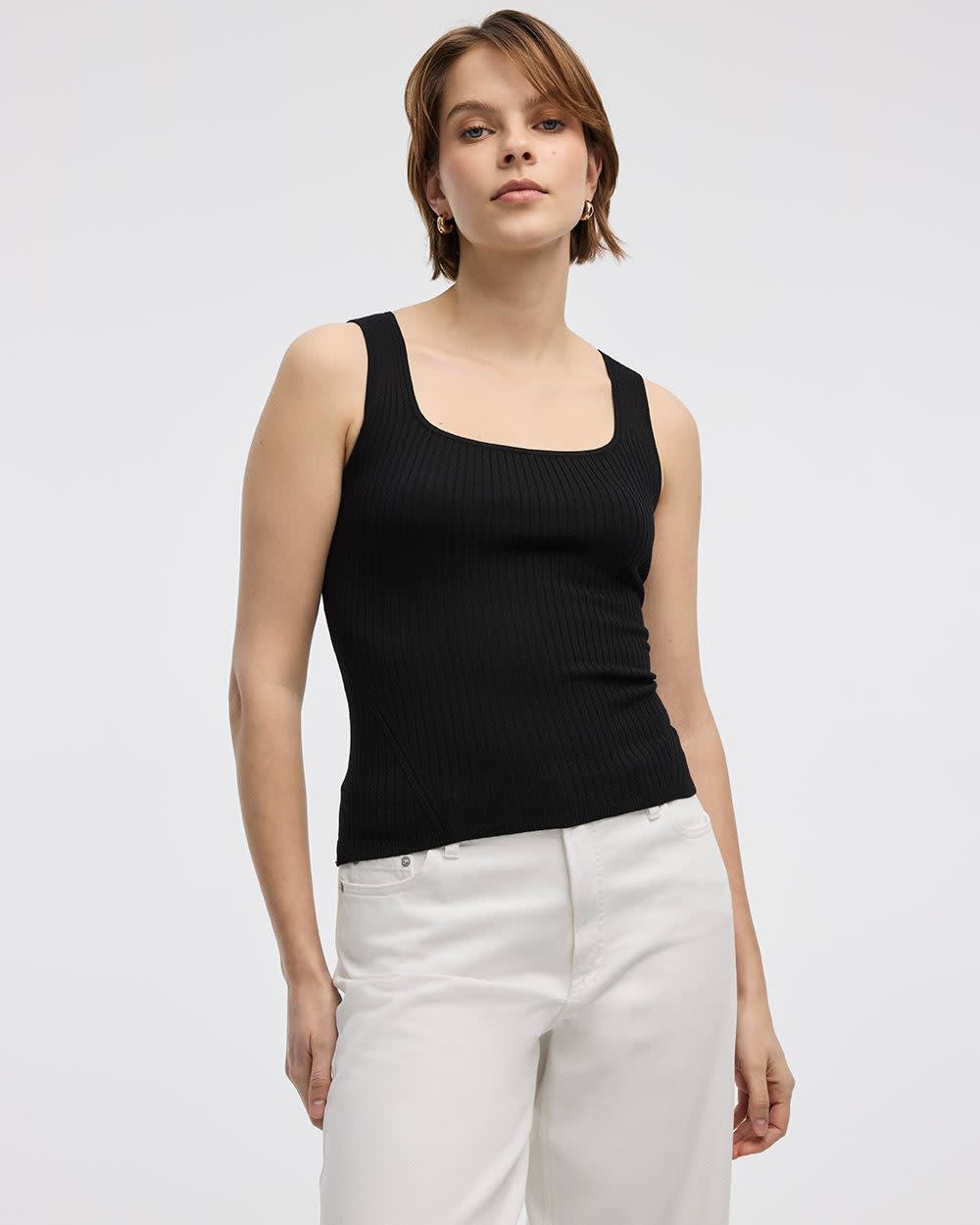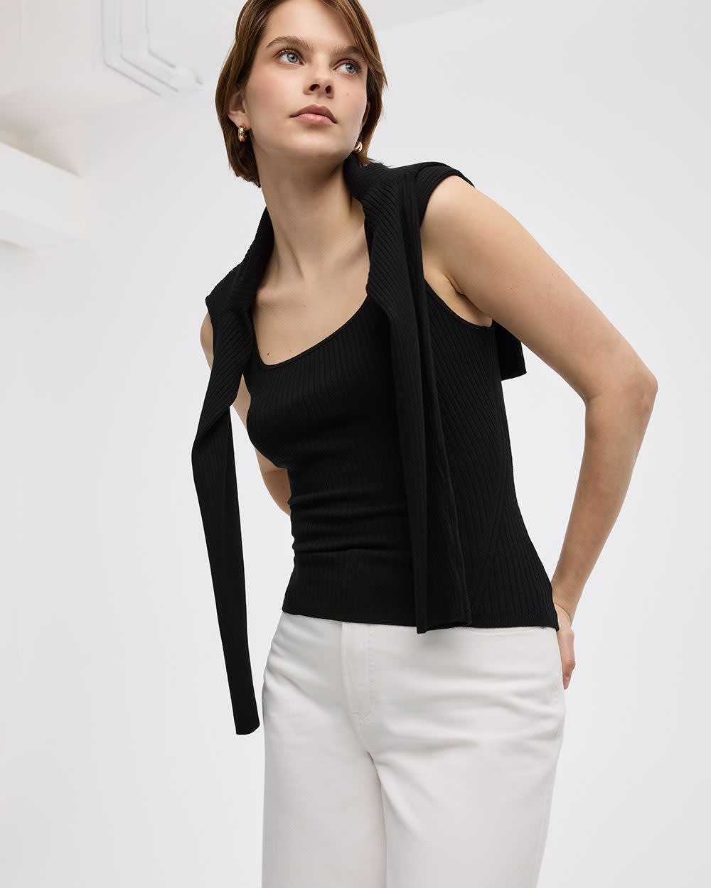 "This top made in a comfortable ribbed knit and designed in a bodycon fit is the perfect tank for any occasion. Matching cardigan available.