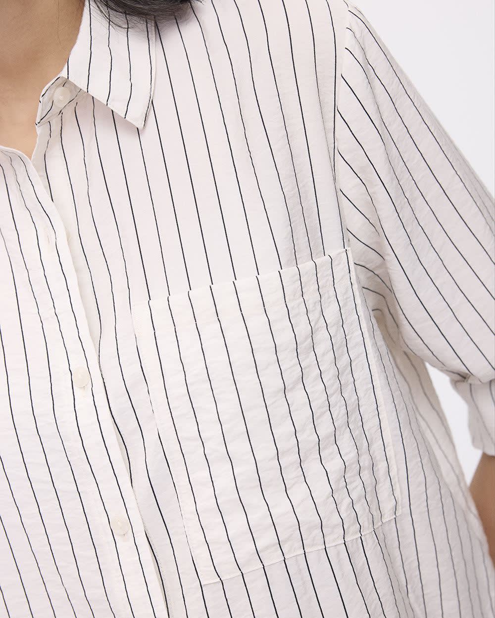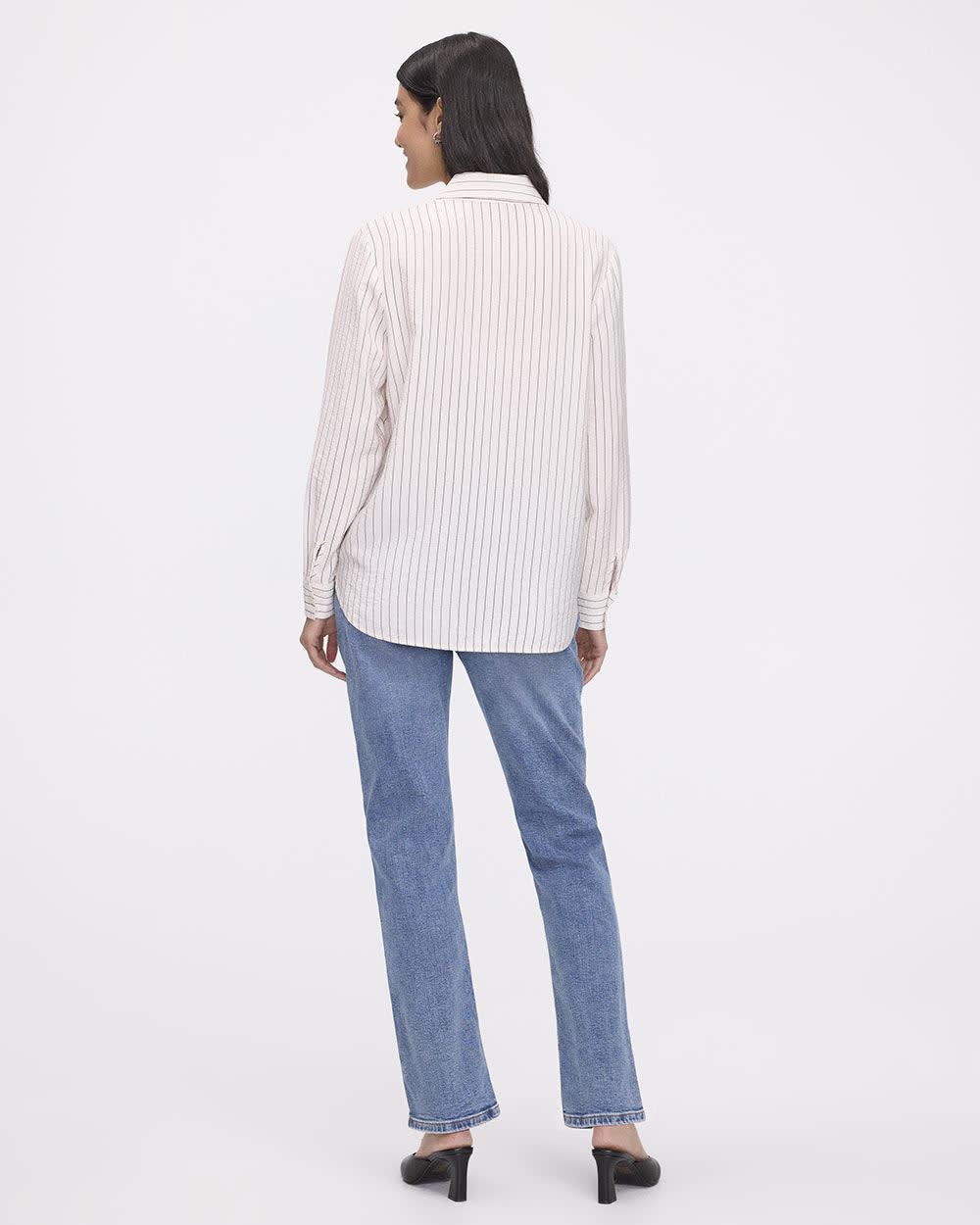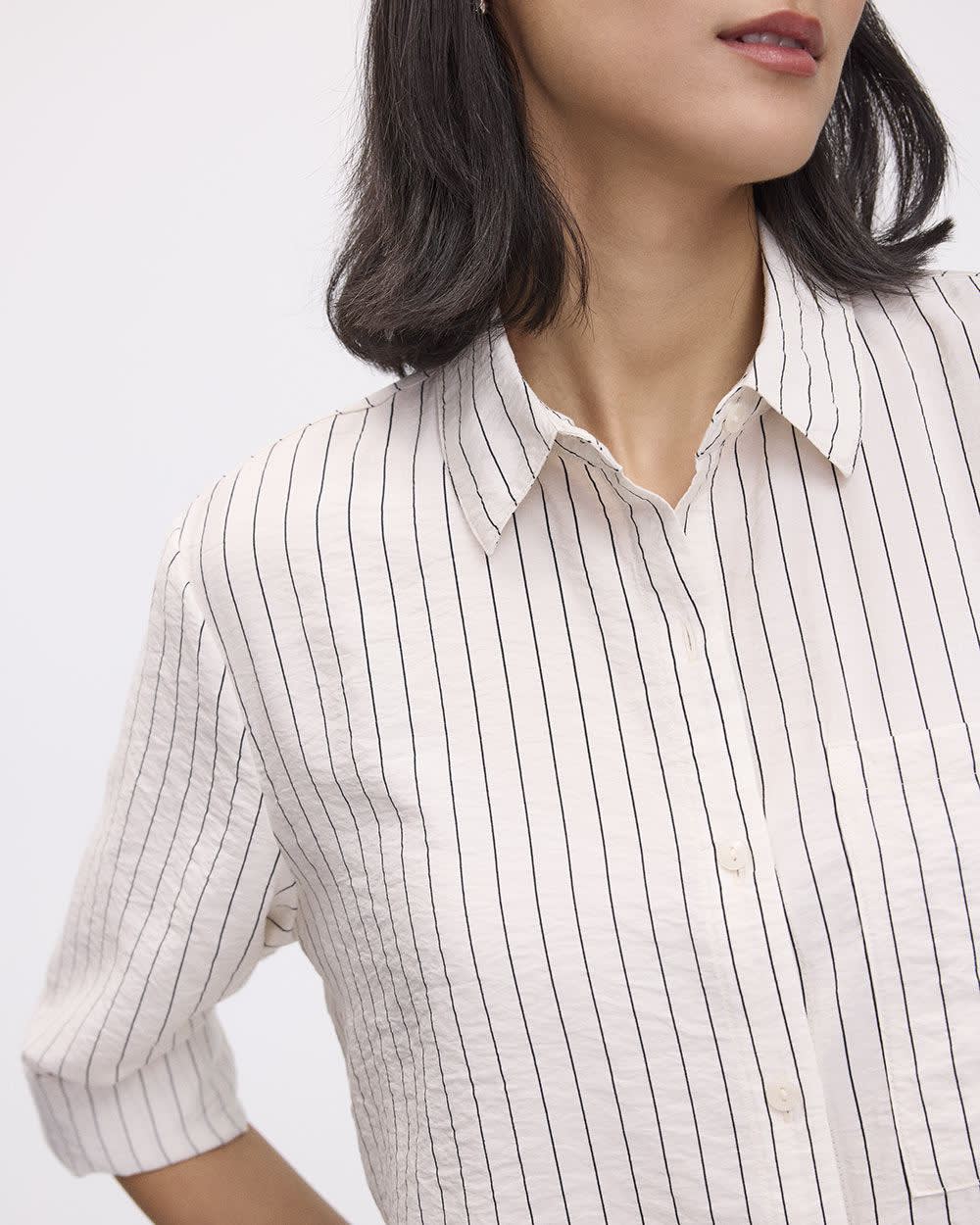 Simple, yet elegant, this lovely striped buttoned-down blouse pairs perfectly with any bottom.