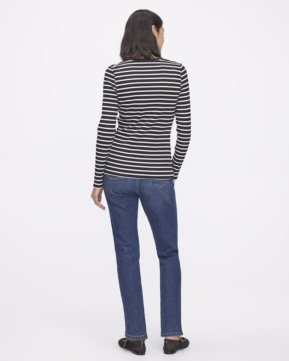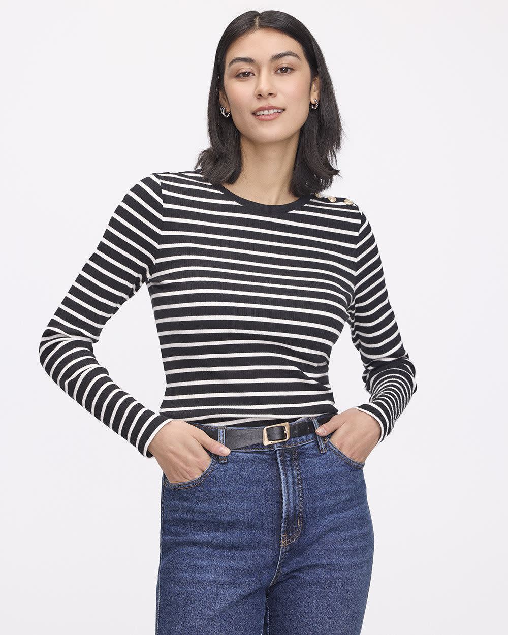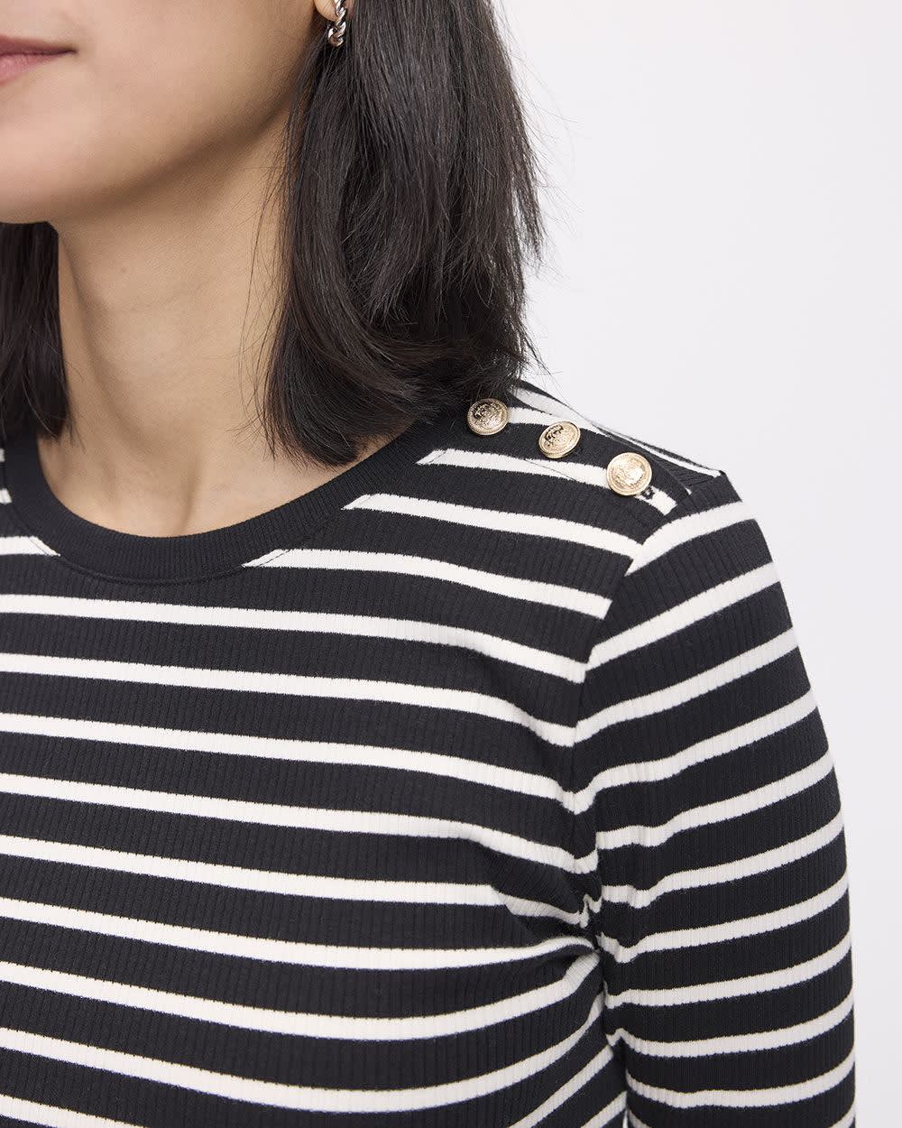 You'll love the stretch ribbed knit of this fitted crew-neck tee, made with long sleeves and featuring cute buttons on the shoulder that make it unique.