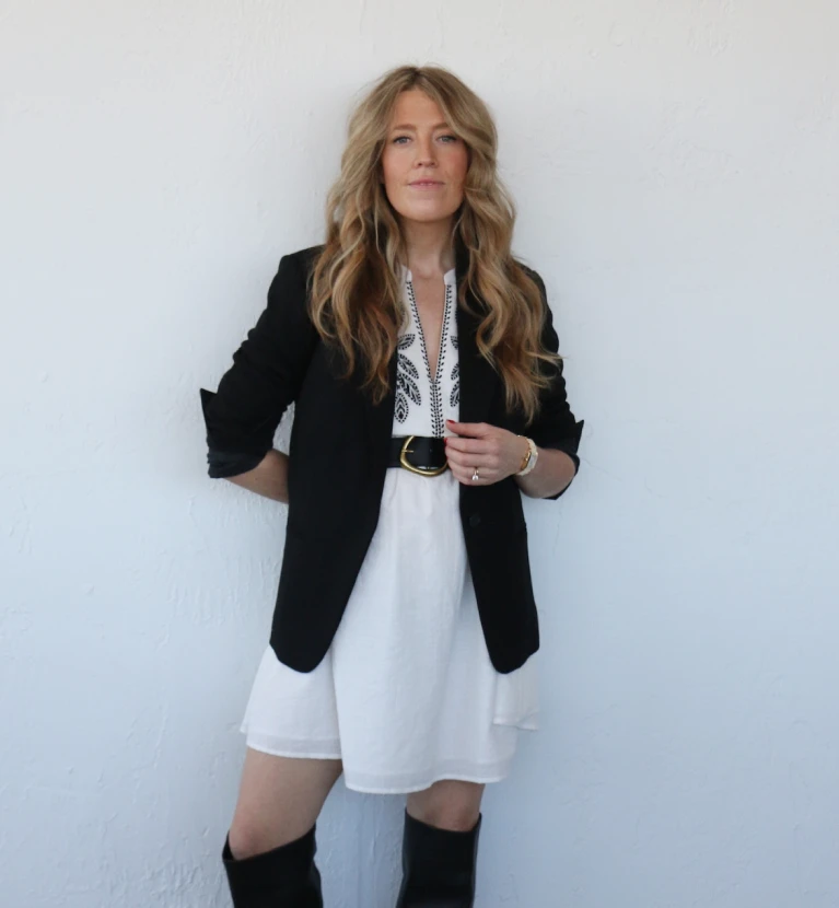 Fall Transition: For lower temps, opt for structure and texture with a tailored blazer. Refine the look with closed-toe shoes and a coordinating belt.