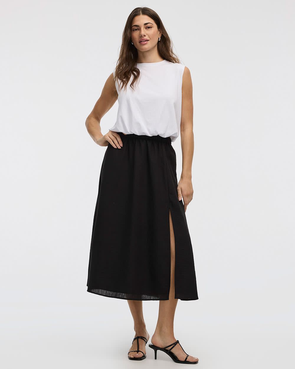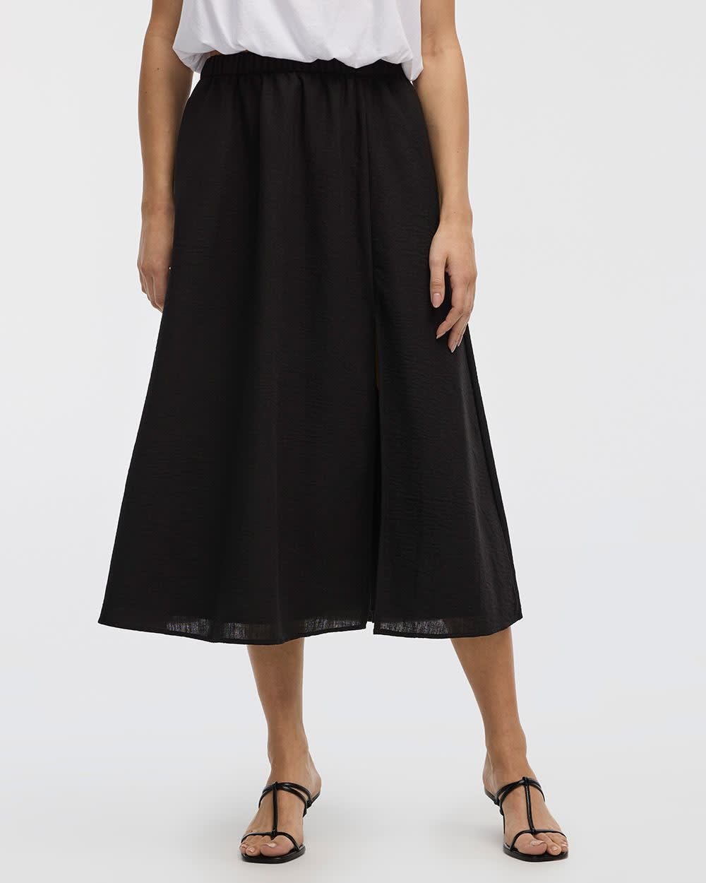"Made in a comfortable woven fabric, nothing beats the style of this midi skirt featuring a distinctive front slit.