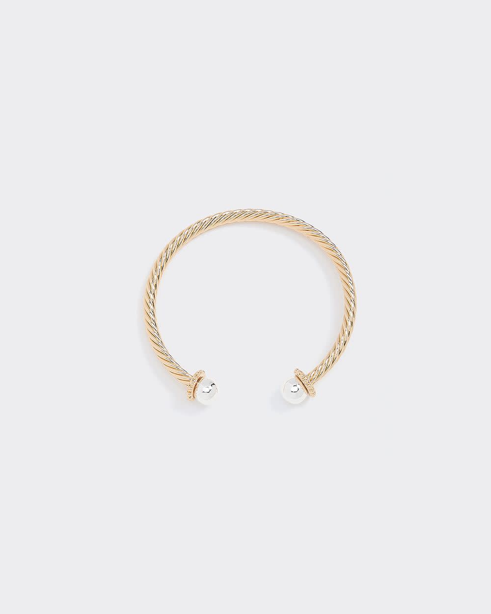 Add an elegant touch to your outfit with this lovely twisted open bracelet made of two-tone metal.