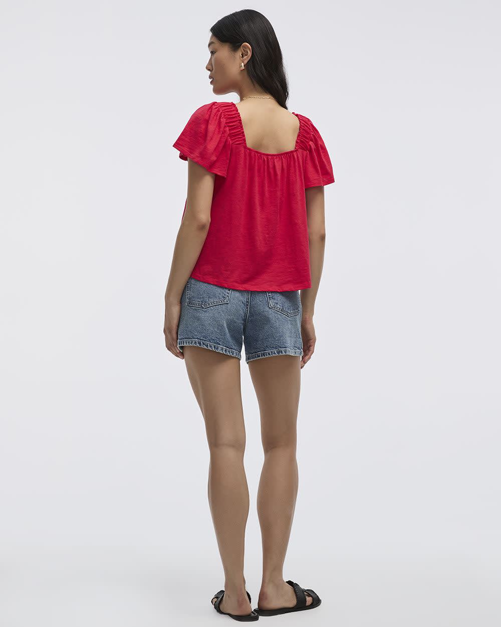 Cette confortable blouse dotée d'un col carré et de jolies manches à volants s'agence parfaitement avec votre paire de shorts en denim favorite.