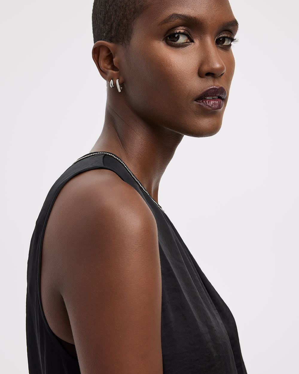Cette élégante blouse sans manches eeffet satin, orné de bijoux lui procure une touche de brillance et s'agence parfaitement avec n'importe quel bas.