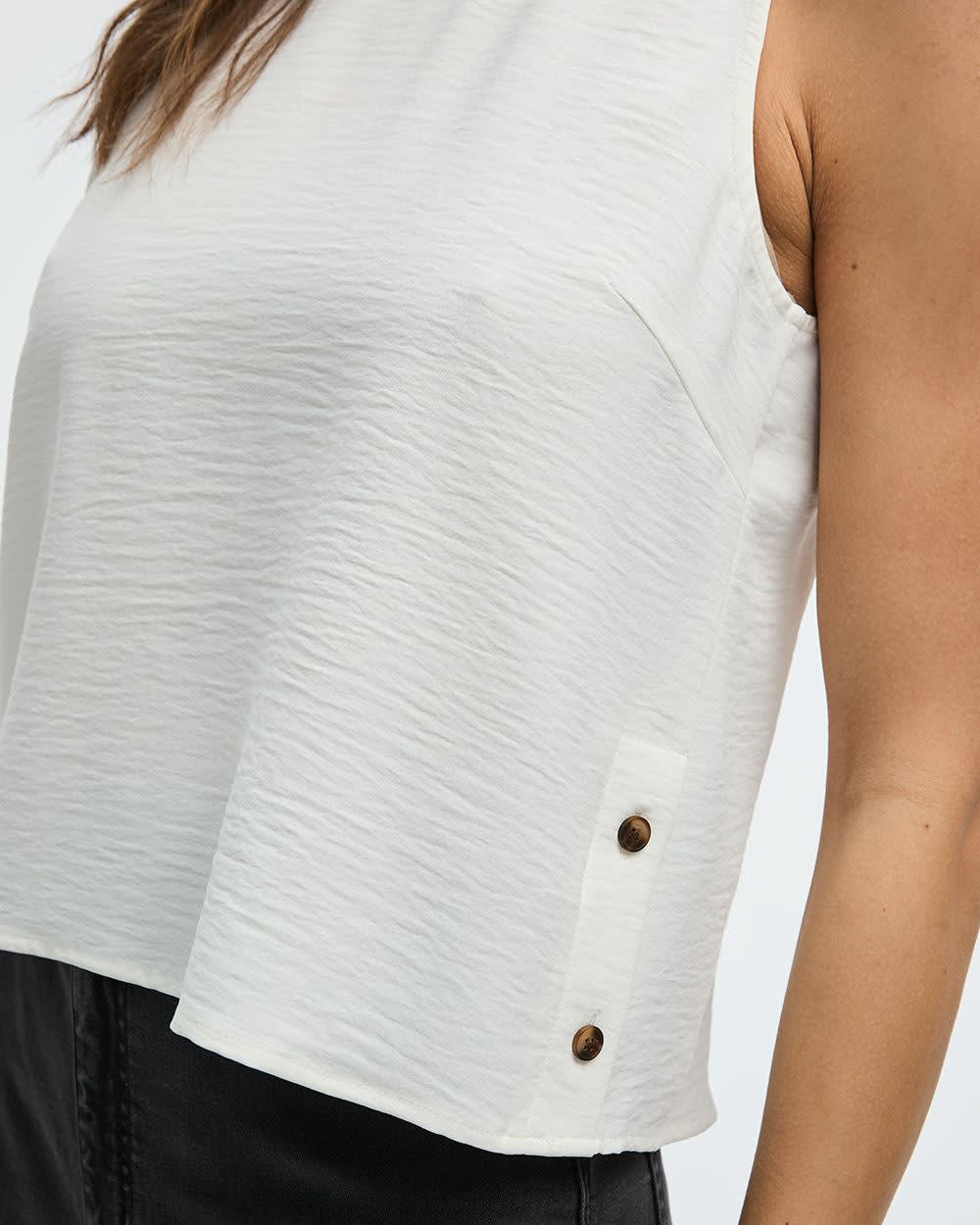 Super jolie, on adore l'élégance simple de cette blouse sans manches rehaussée de boutons sur les côtés.
