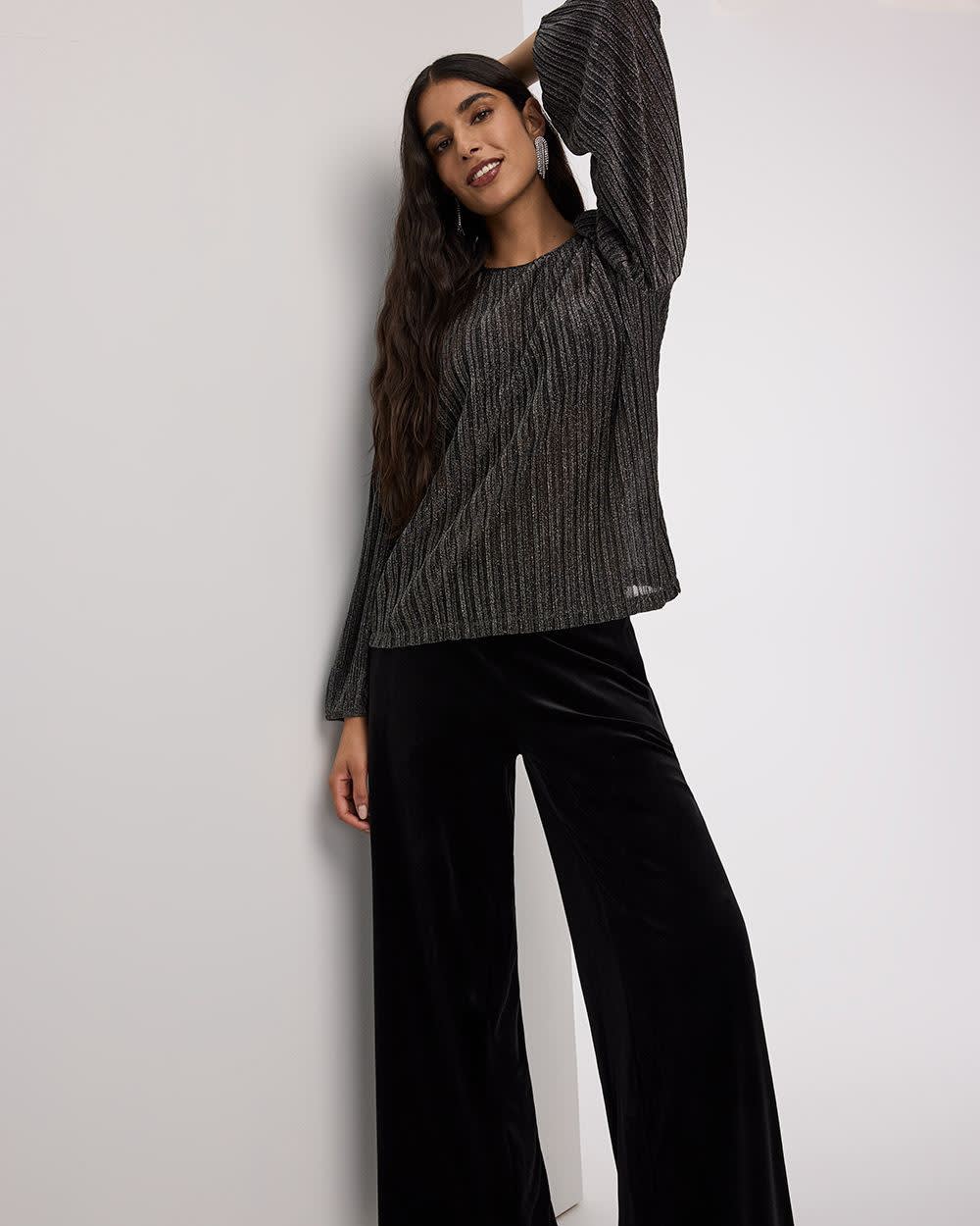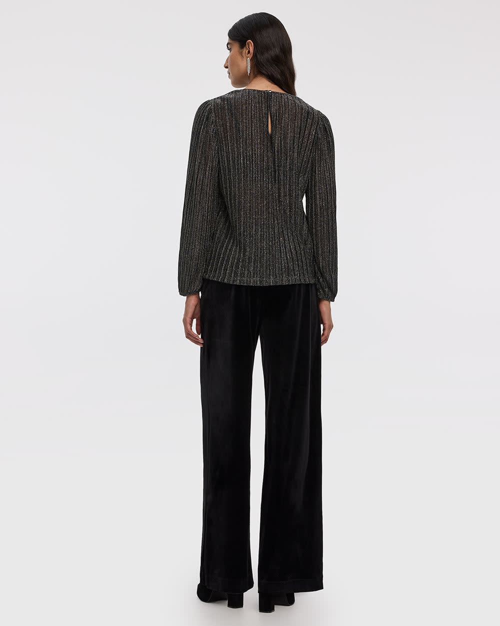 Ajoutez du style à votre tenue avec cette blouse super tendance conçue en tricot scintillant et dotée d'un col rond et de féminines manches longues bouffantes.