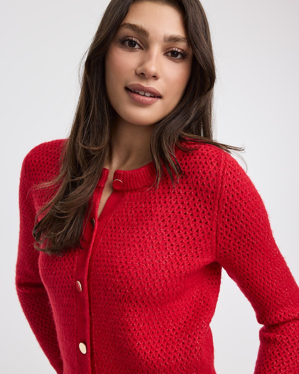 Ce cardigan ajusté conçu en mailles de fantaisie et doté d'un classique col rond et de manches longues est idéal pour le quotidien.