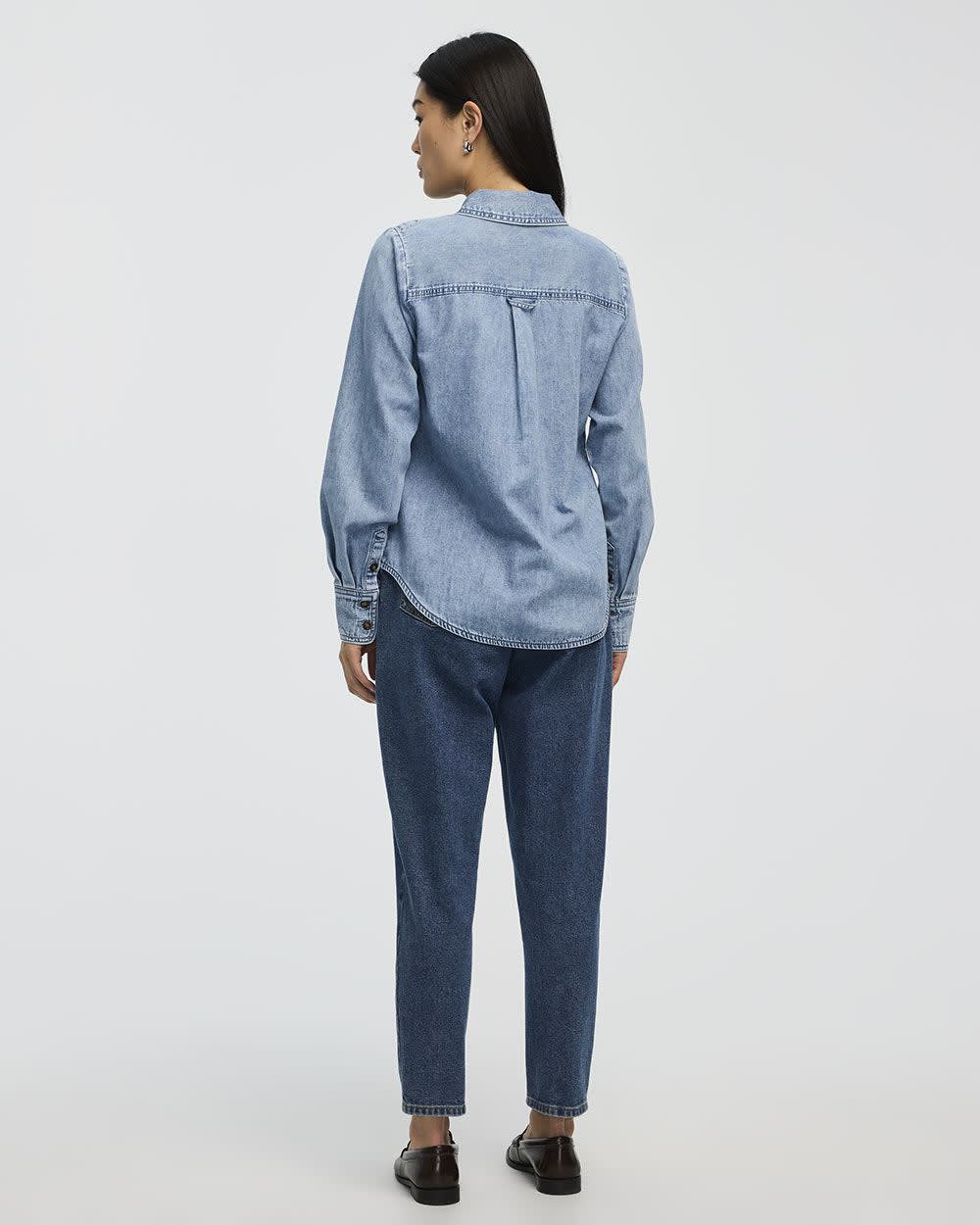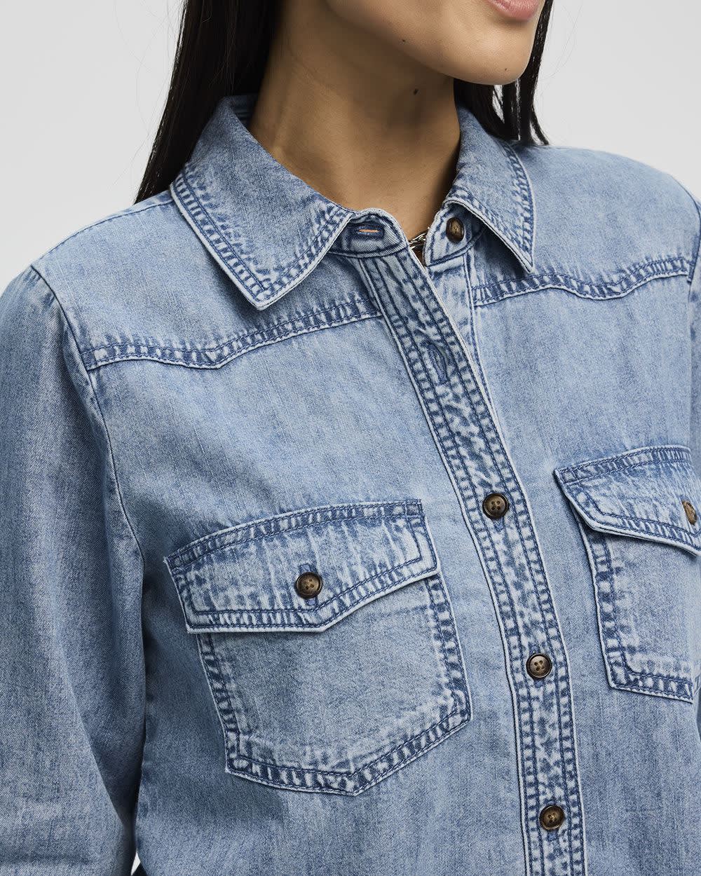 Simple et élégante, cette jolie blouse en denim dotée de poches utilitaires tendance à la poitrine s'agence parfaitement avec n'importe quel bas.