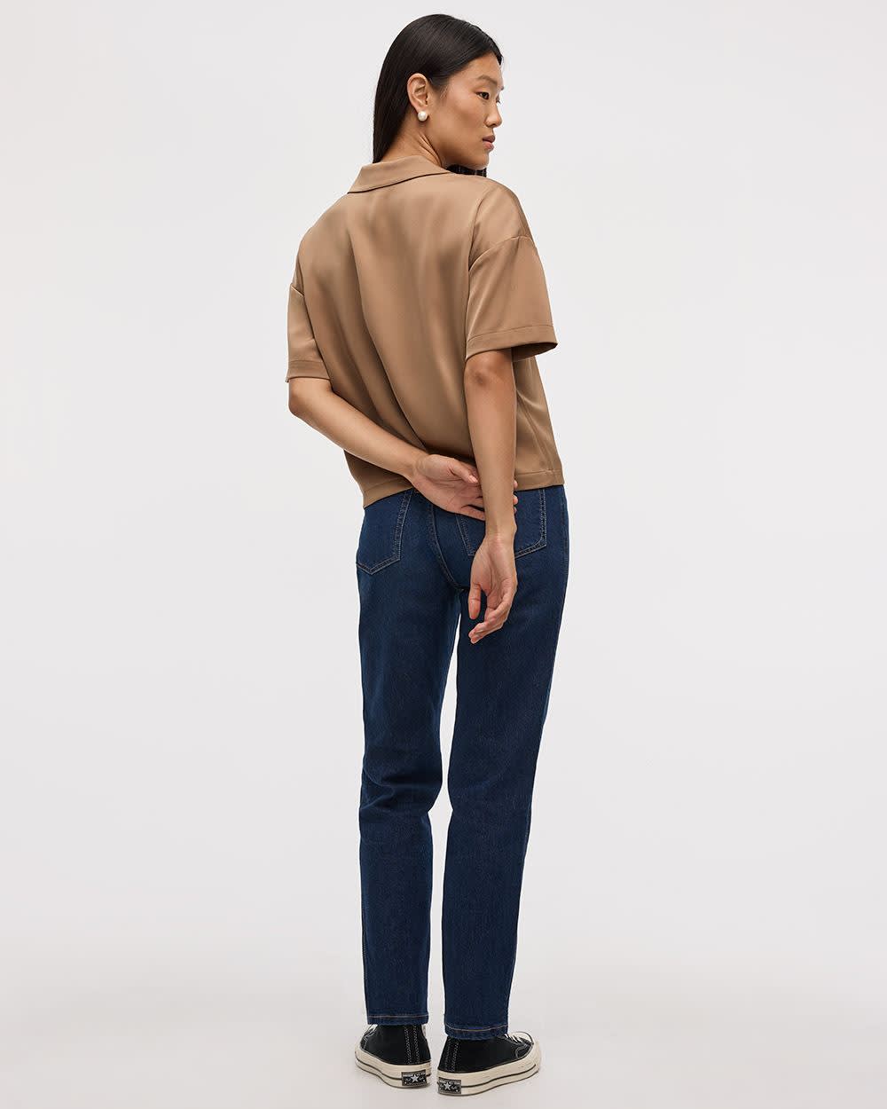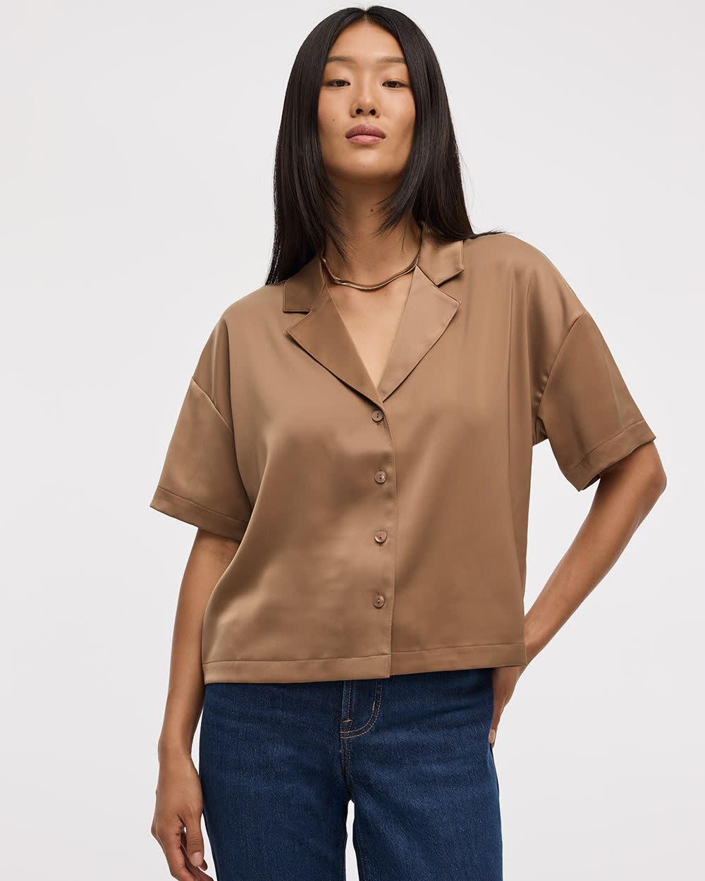 Cette chemise satinée à manches courtes dotée d'un col pyjama s'agence parfaitement avec n'importe quel bas, pour un style chic ou décontracté.