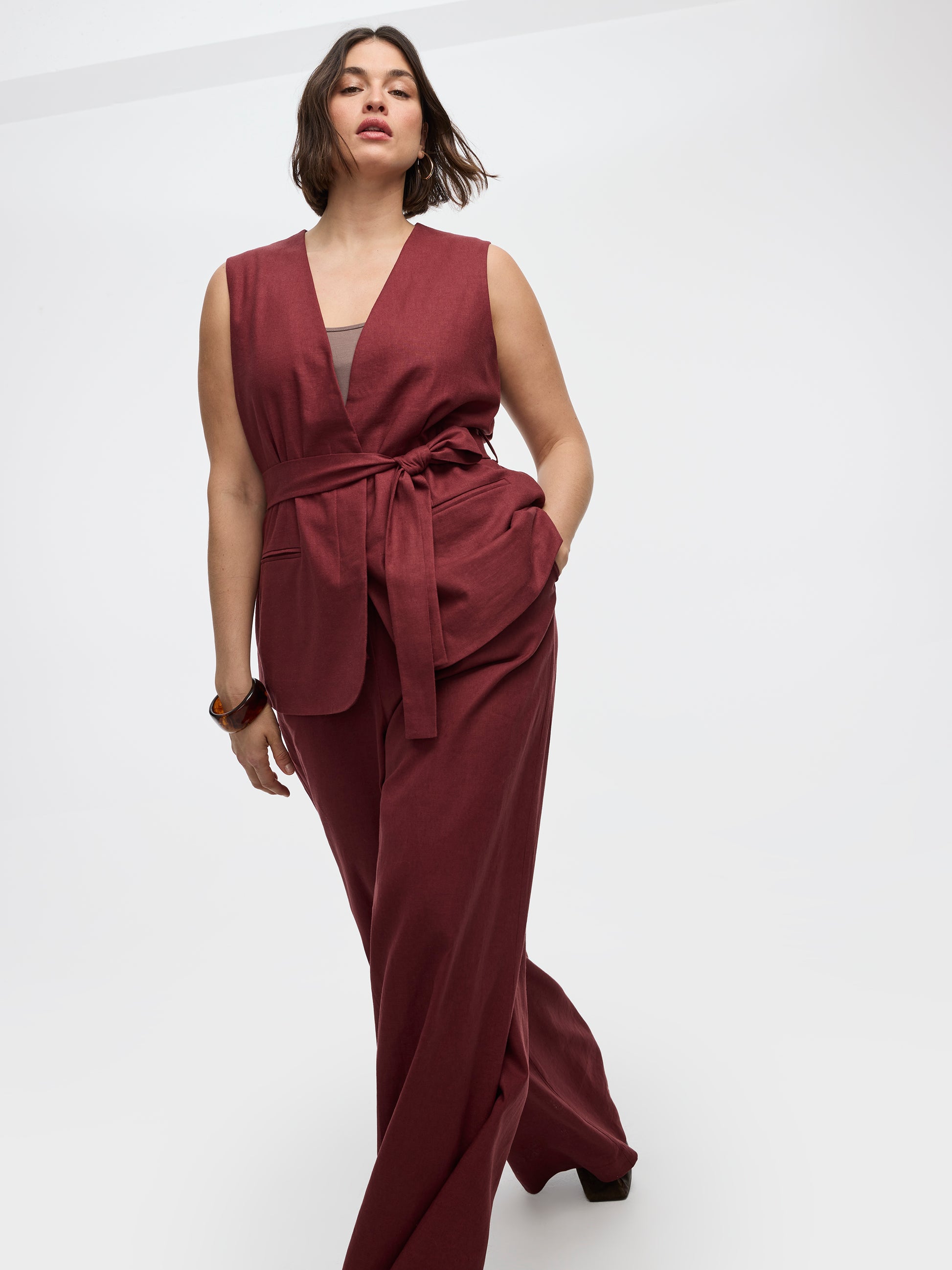 Conçu dans un mélange de lin respirant, ce veston sans manches au style moderne est doté d’une ceinture à nouer à la taille pour un effet cintré. Une pièce polyvalente qui apporte une élégance décontractée à toutes vos tenues.