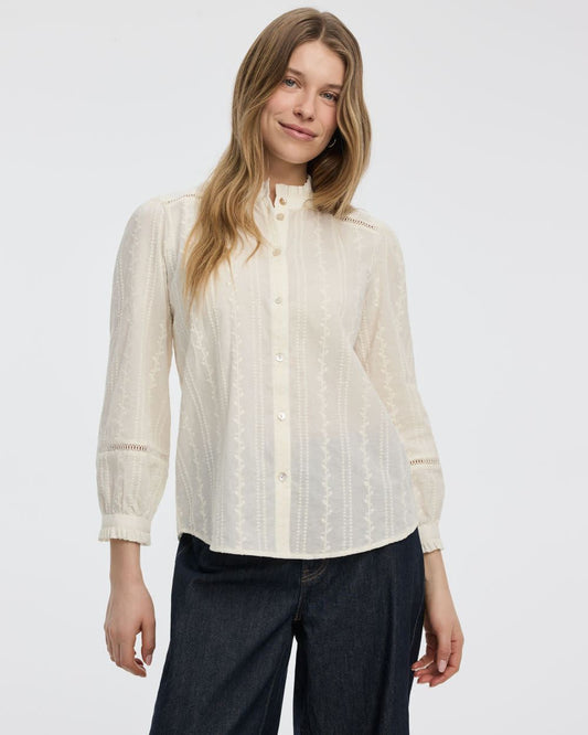 Ajoutez du style à votre garde-robe saisonnière avec cette jolie blouse dotée d'un col rond, de manches à volants et de féminins détails brodés.