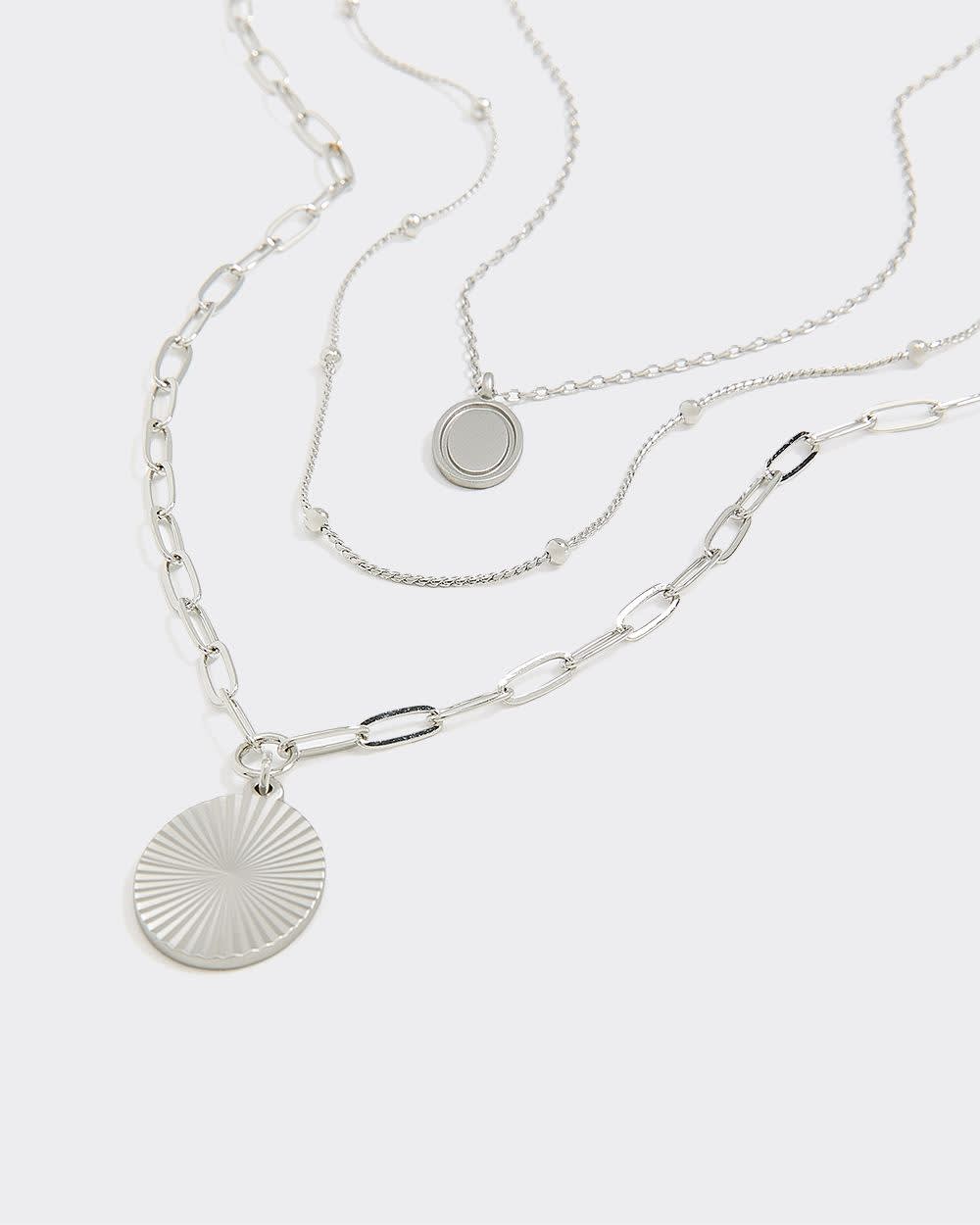 "Ajoutez une touche brillante à votre tenue avec ce délicat collier à chaînes multiples doté de jolis pendentifs circulaires. Un accessoire qui ne passera pas inaperçu.
