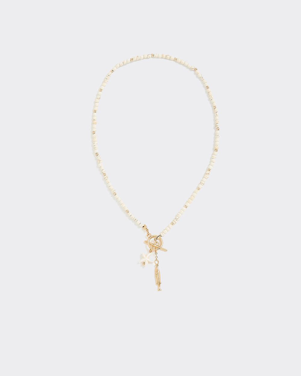 Rehaussez votre look de vacances avec ce joli collier court fabriqué de billes naturelles et doté d'adorables breloques de poissons.