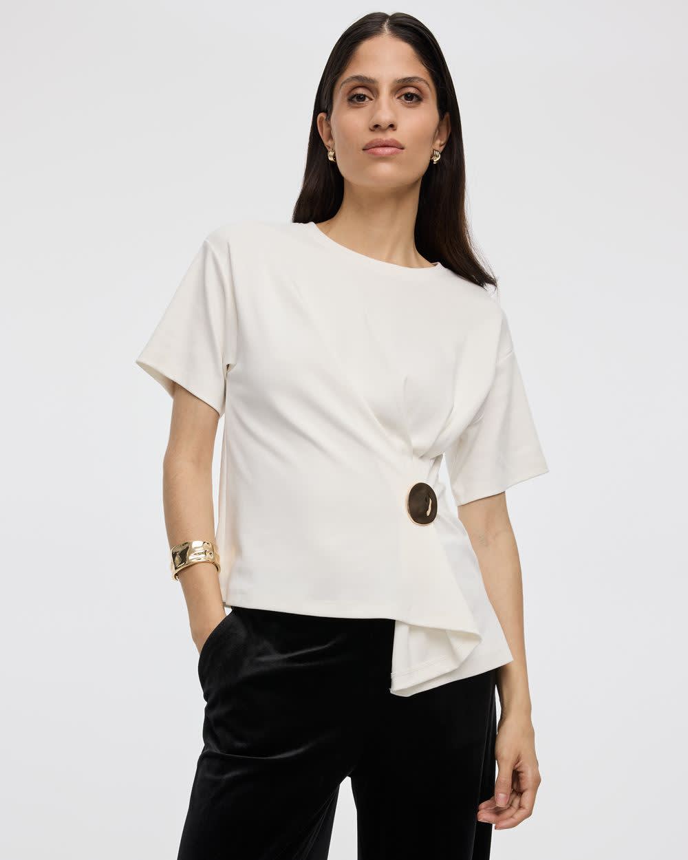 Ce haut chic à manches courtes et col rond se distingue par sa taille cintrée définie par une broche amovible, pour un style élégant au quotidien.
