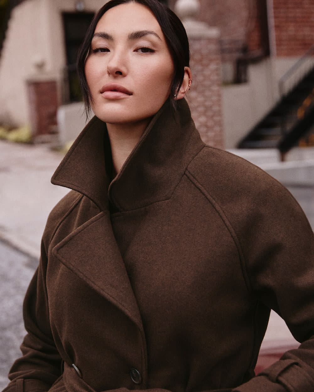 Peaufinez vos tenues de mi-saison avec ce magnifique manteau trench en fausse laine doté d'une ceinture à nouer à la taille.