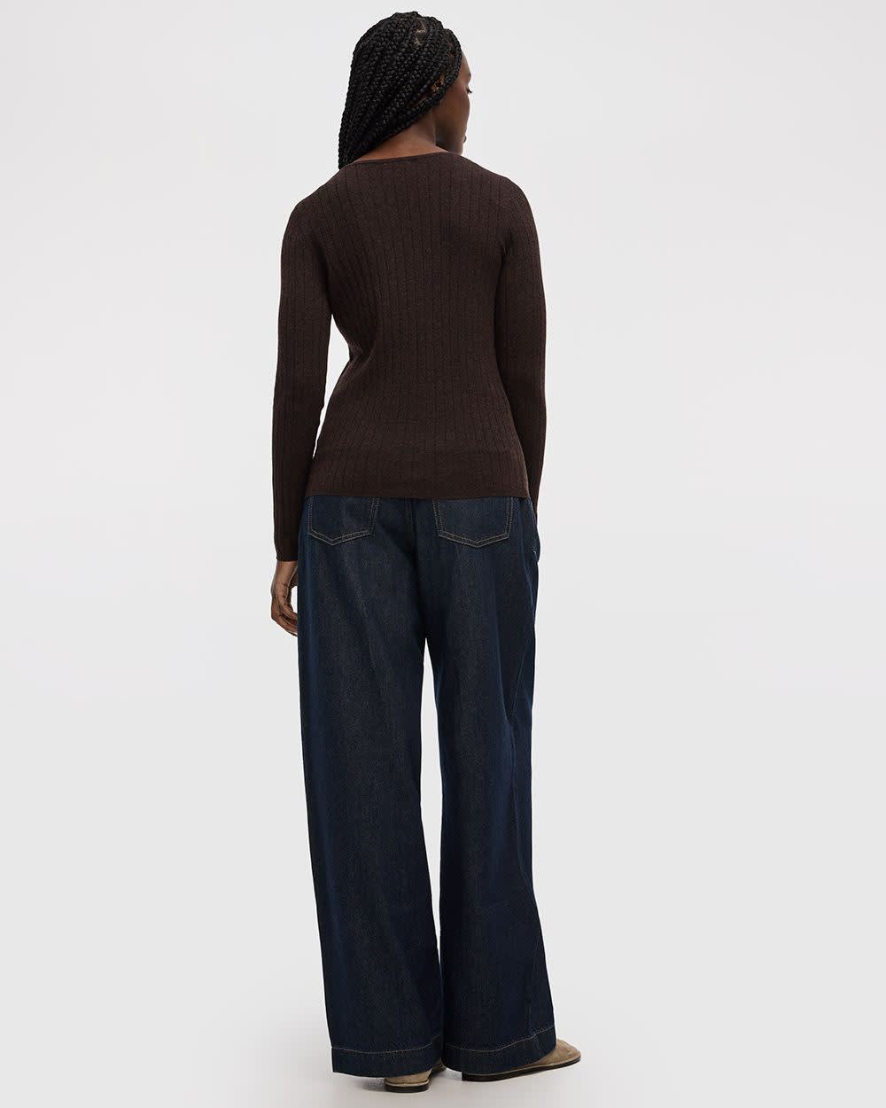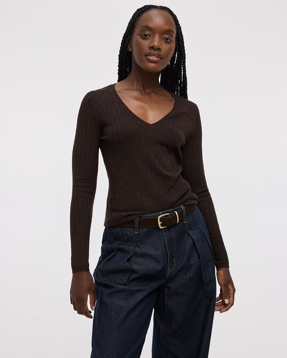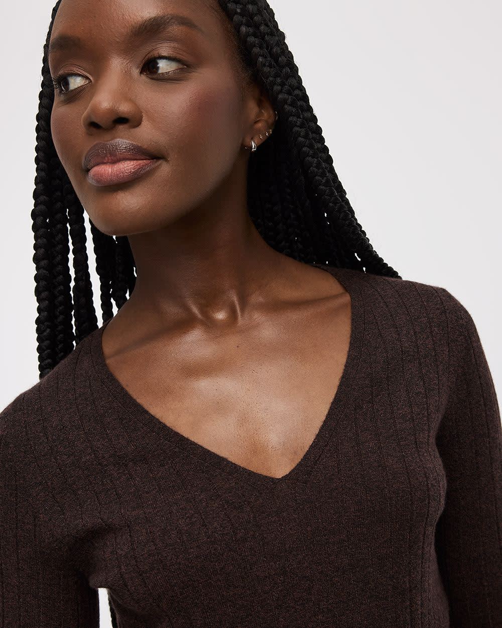 "Ce pull à manches longues et col V conçu dans un unique tricot à côtelé large est un essentiel à ajouter à votre garde-robe, parfait pour la vie de tous les jours.