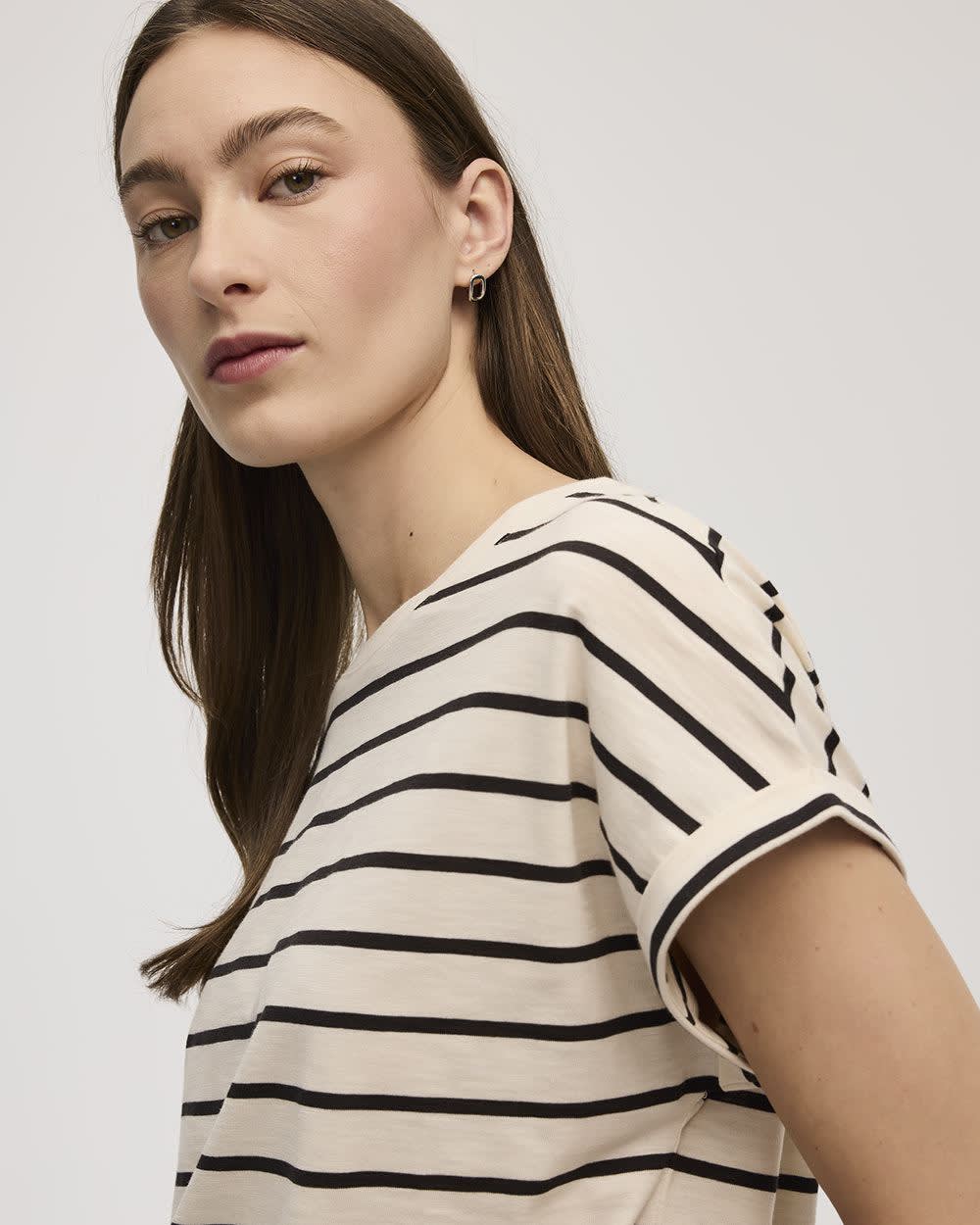 "Doté de manches courtes et d'un col rond, ce t-shirt semi-ajusté à rayures est un essentiel pour le quotidien.