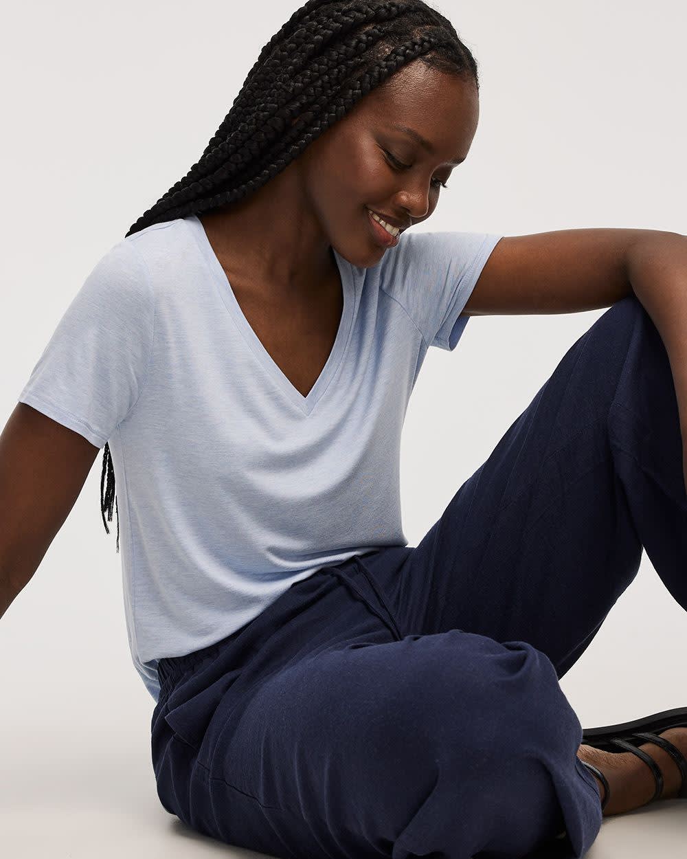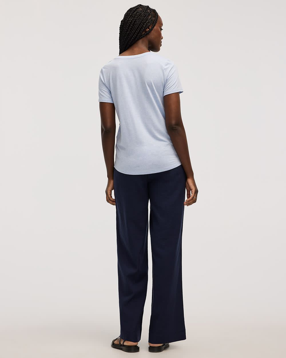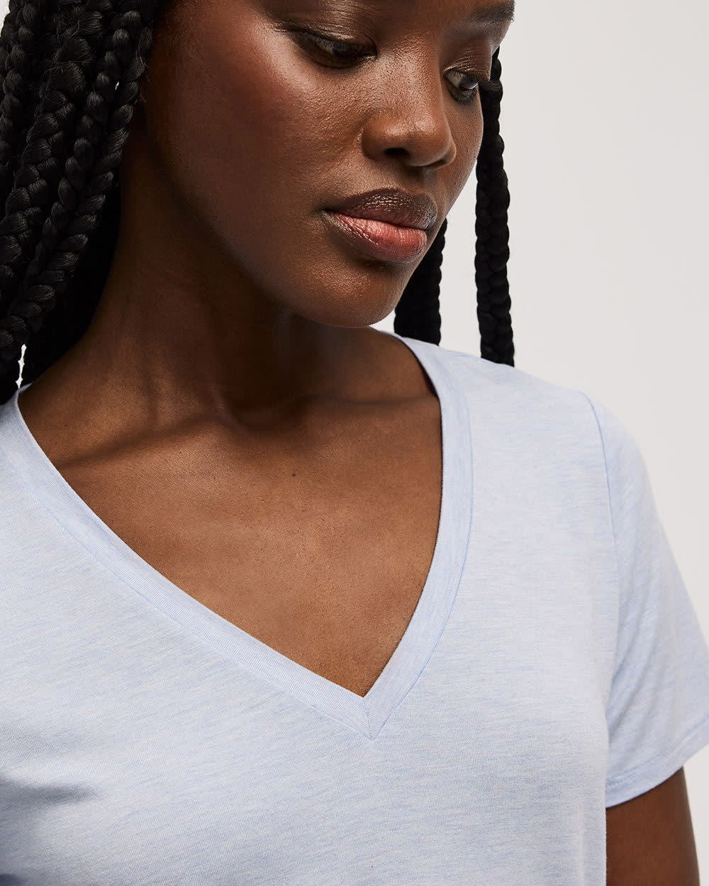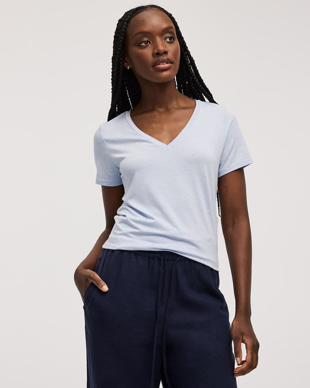 Ce t-shirt à manches courtes et col V est un essentiel à ajouter à votre garde-robe conçu dans un tissu responsable pour un confort douillet.