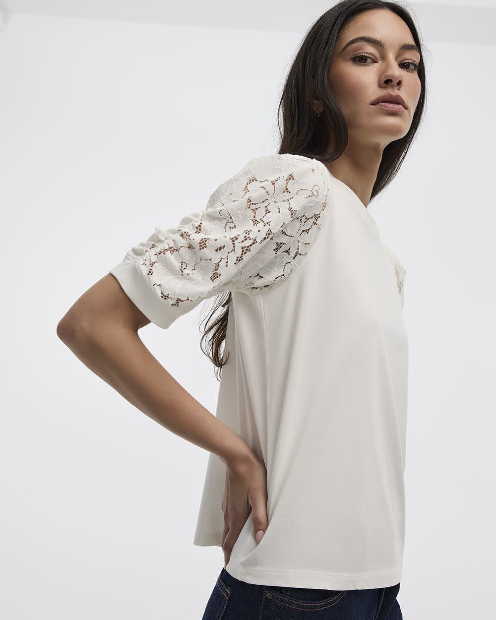 T-shirt bimatière à manches aux coudes bouffantes et col rond