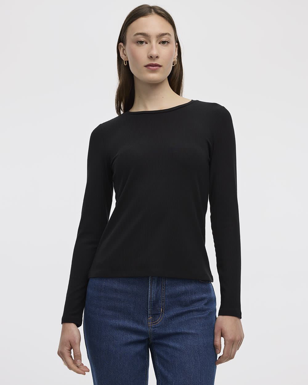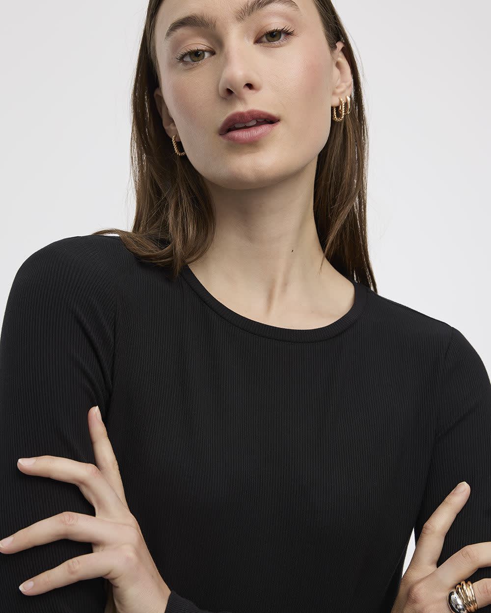 "Un essentiel, ce t-shirt à col rond et manches longues conçu en doux tricot côtelé est si confortable que vous ne pourrez plus vous en passer.