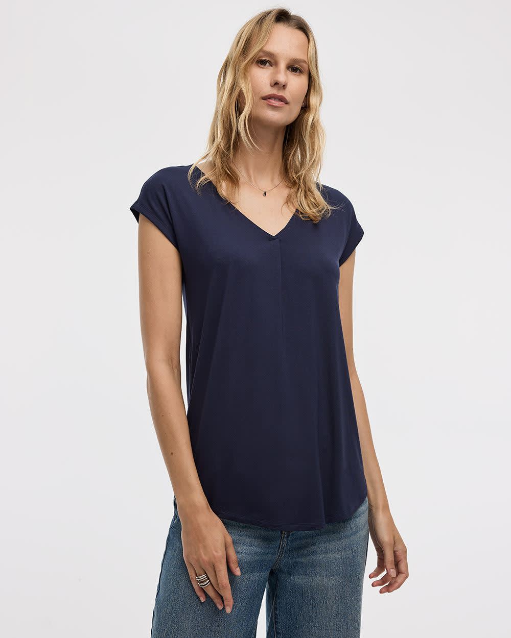 "Cette confortable tunique semi-ajustée dotée d'un col V et de manches très courtes s'agence parfaitement avec votre paire de leggings favorite.